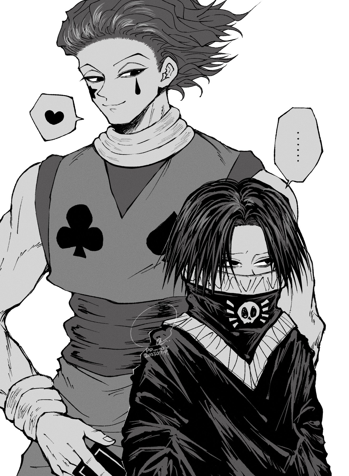 ... 2boys card club_(shape) covered_mouth feitan_portor greyscale heart height_difference highres hisoka_morow holding holding_card hunter_x_hunter looking_to_the_side male_focus monochrome multiple_boys ppox short_hair simple_background smile spade_(shape) spoken_ellipsis spoken_heart upper_body white_background