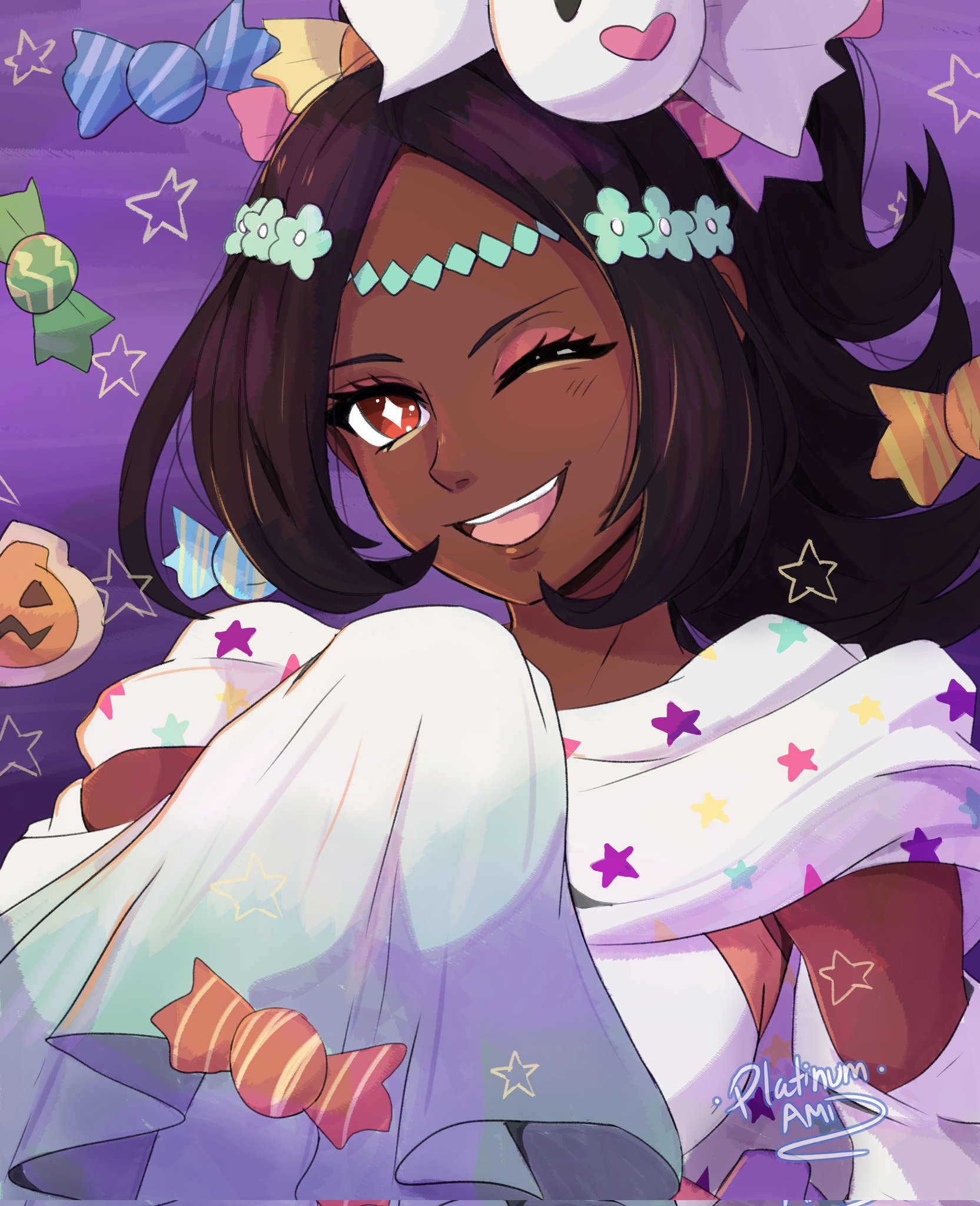 1girl artist_name brown_eyes brown_hair candy cookie dark-skinned_female dark_skin fire_emblem fire_emblem_engage fire_emblem_heroes food ghost_hair_ornament halloween halloween_costume highres lips looking_at_viewer nintendo official_alternate_costume one_eye_closed open_mouth platinum_ami ponytail smile solo star-shaped_pupils star_(symbol) symbol-shaped_pupils timerra_(fire_emblem) timerra_(halloween)_(fire_emblem) upper_body