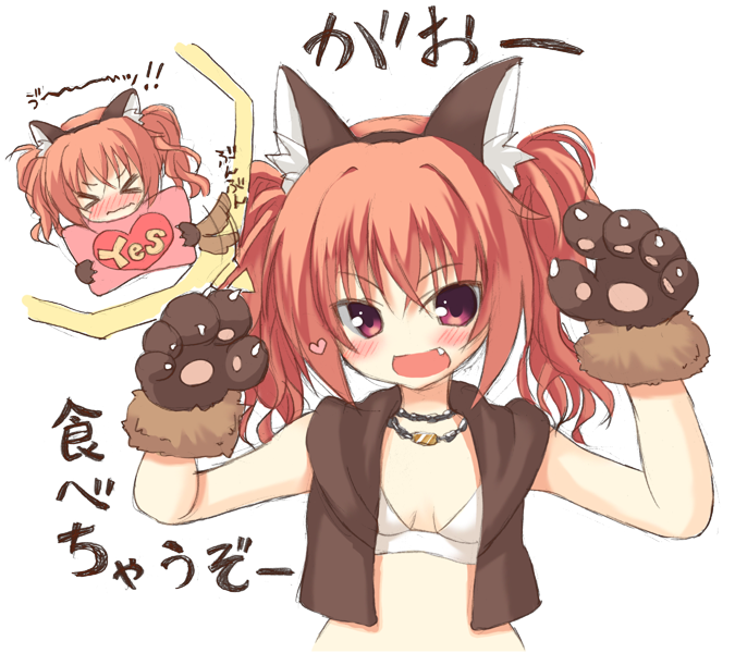 >_< 1girl :d animal_ear_fluff animal_ears animal_hands blush bra breasts brown_vest commentary_request crossed_bangs embarrassed fang gloves hair_between_eyes hands_up heart inaba_meguru jewelry long_hair necklace official_alternate_costume official_alternate_hairstyle open_clothes open_mouth open_vest orange_hair paw_gloves red_eyes sanoba_witch simple_background small_breasts smile solo sound_effects speech_bubble tatsuya_(trypaint) thought_bubble translation_request twintails underwear upper_body vest wavy_hair white_background white_bra wolf_ears yes yes-no_pillow