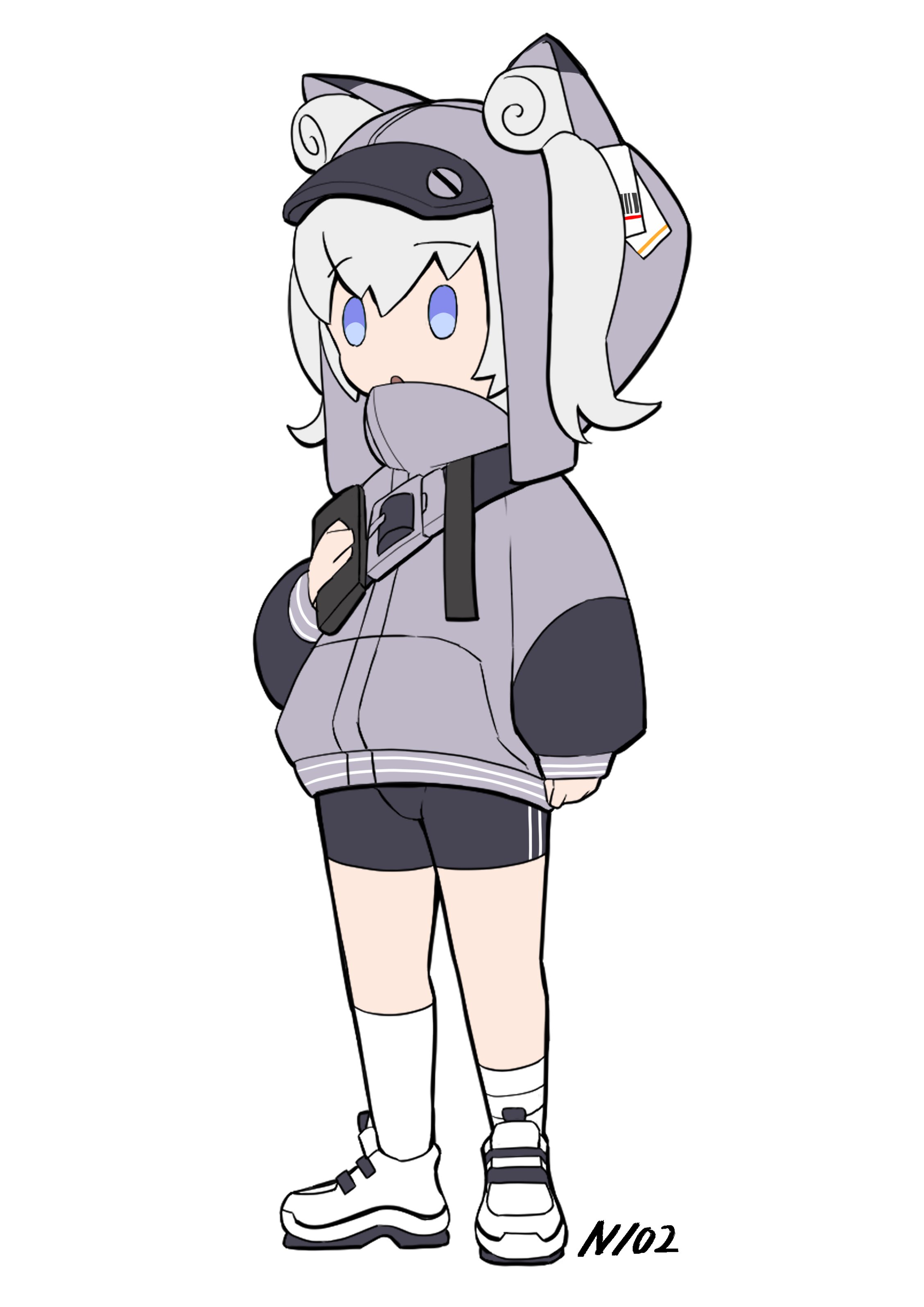 1girl :o absurdres animal_ear_headwear animal_ears asymmetrical_legwear bike_shorts black_jacket black_shorts blue_eyes character_name double_bun fake_animal_ears full_body goddess_of_victory:_nikke grey_hair grey_jacket hair_between_eyes hair_bun highres holding holding_notebook jacket kitasshi mismatched_legwear multicolored_jacket n102_(nikke) notebook shoes short_hair short_shorts shorts simple_background sneakers socks solo two-tone_jacket visor_cap white_background white_socks