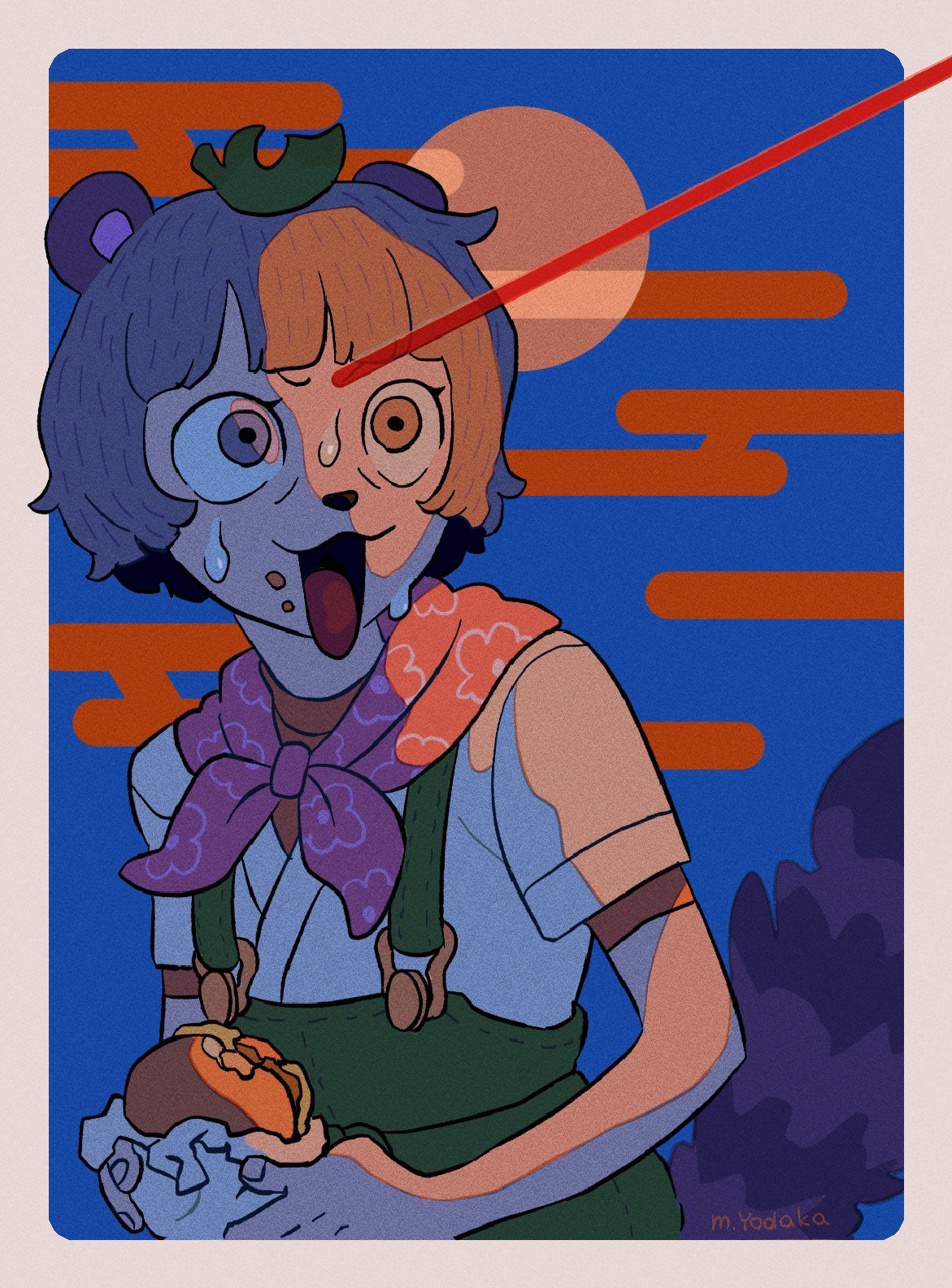 1girl :3 animal_ears animal_nose artist_name bandana bandana_around_neck blue_background blunt_bangs border burger commentary_request egasumi food food_bite food_on_face full_moon furrowed_brow green_overalls grey_eyes grey_hair highres holding holding_food laser laser_pointer_projection leaf leaf_on_head looking_to_the_side mode_aim moon mukudori_yodaka nervous nervous_sweating open_mouth orange_shirt outside_border overalls peril ponpoko_(vtuber) raccoon_ears raccoon_girl raccoon_tail shirt short_sleeves simple_background solo sweat tail tail_raised undershirt upper_body virtual_youtuber white_border wide-eyed