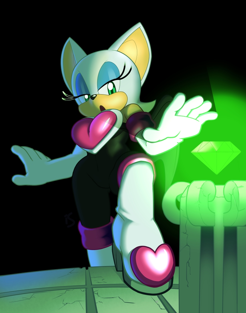 1girl animal_ears animal_nose artist_name bare_shoulders bat_ears bat_girl bat_wings black_wings blue_eyeshadow body_fur boots chaos_emerald elbow_gloves eyeshadow female_focus furry furry_female gem gloves glowing green_eyes green_gemstone half-closed_eyes hands_up heart high_heels makeup open_mouth reaching rockthebull rouge_the_bat short_hair signature solo sonic_(series) standing theft thigh_boots white_boots white_fur white_gloves white_hair wings