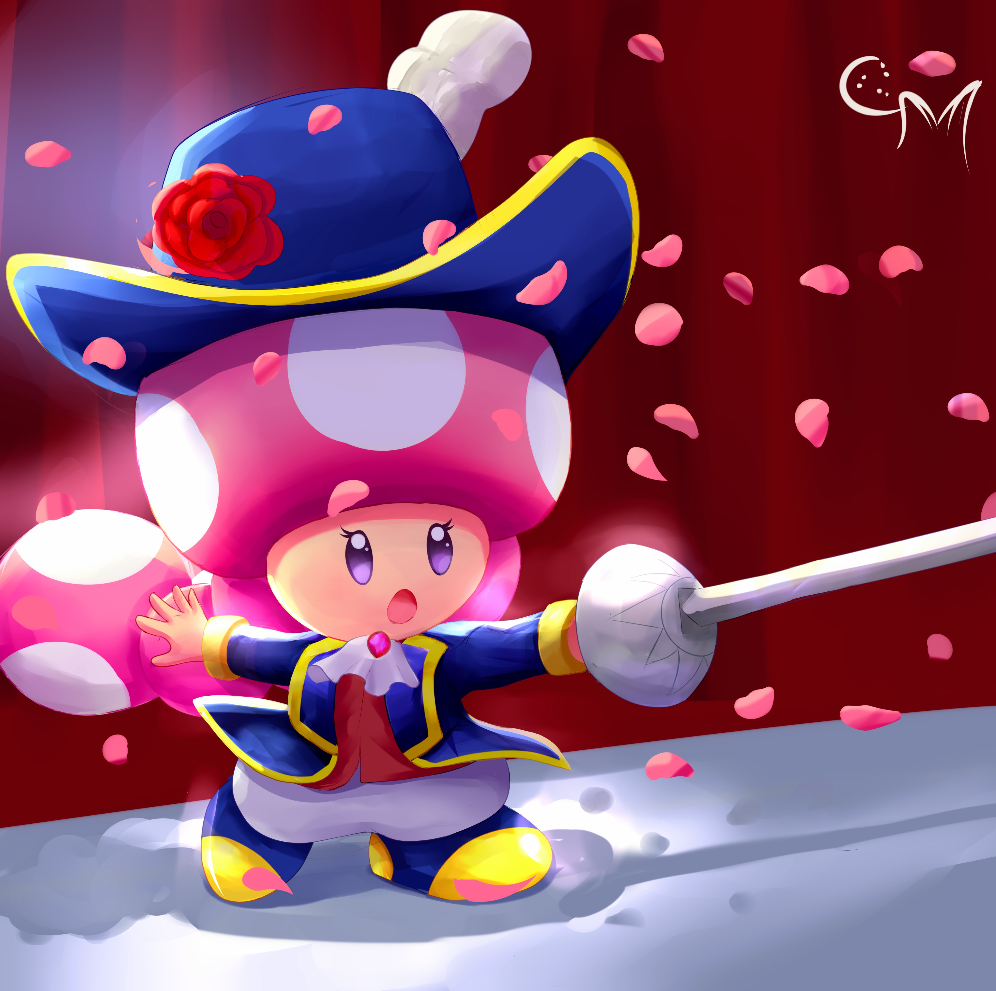 1girl absurdres aristocratic_clothes ascot blue_hat cavalier_hat cookiemixtle cosplay eyelashes fencing flower hat hat_feather hat_flower highres holding holding_sword holding_weapon left-handed mario_(series) nintendo open_mouth pants petals ponytail princess_peach princess_peach:_showtime! princess_peach_(cosplay) purple_eyes rapier curtains red_flower red_rose red_vest rose rose_petals solo sword swordfighter_peach toadette vest weapon white_ascot white_pants