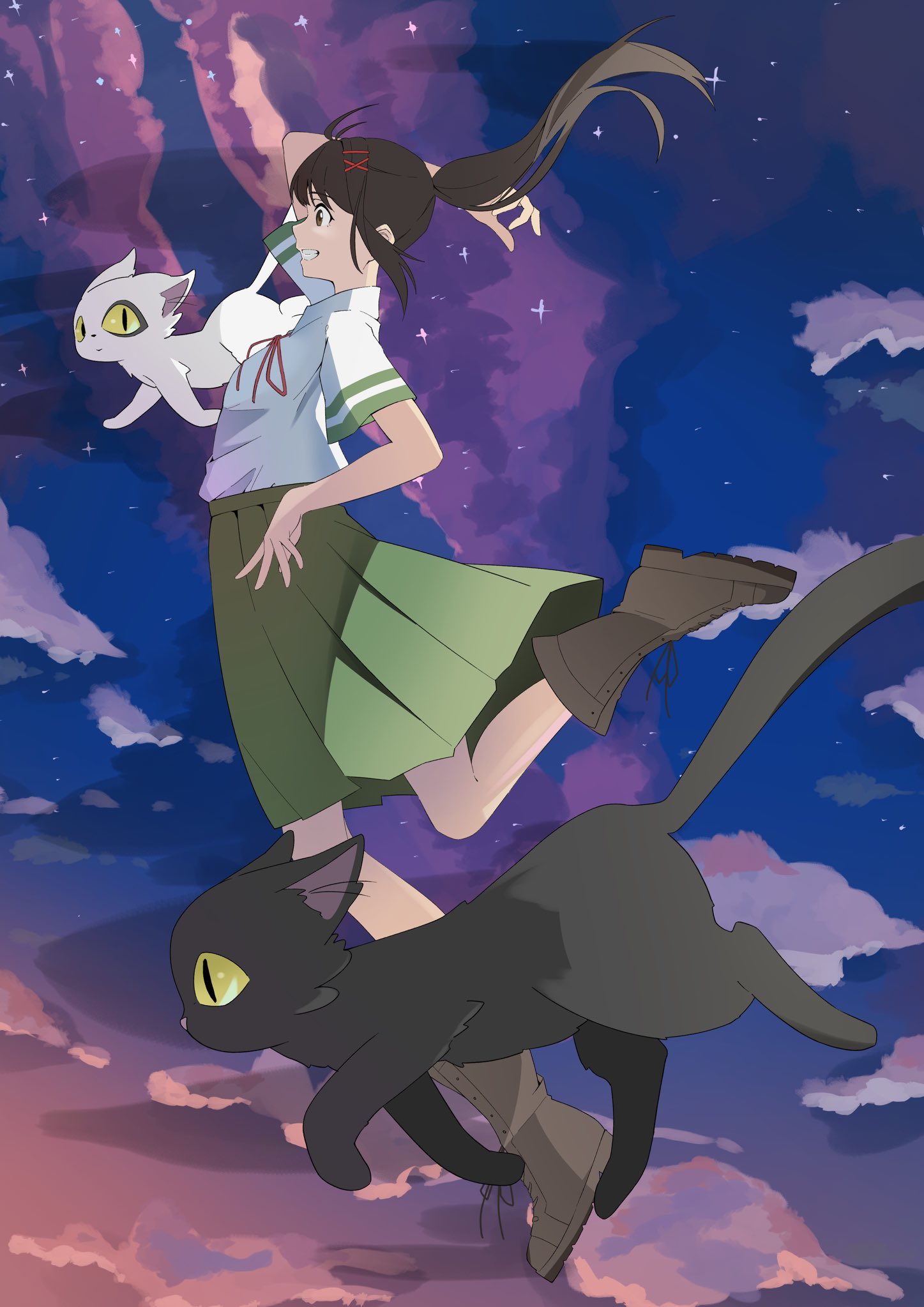 1girl arril100 black_cat blue_sky boots brown_eyes brown_footwear brown_hair cat cloud cloudy_sky from_side full_body gradient_sky green_skirt hair_ornament highres iwato_suzume looking_at_viewer midair neck_ribbon outdoors pleated_skirt ponytail purple_sky red_ribbon ribbon school_uniform shirt short_sleeves skirt sky star_(sky) starry_sky suzume_no_tojimari teeth white_cat white_shirt x_hair_ornament