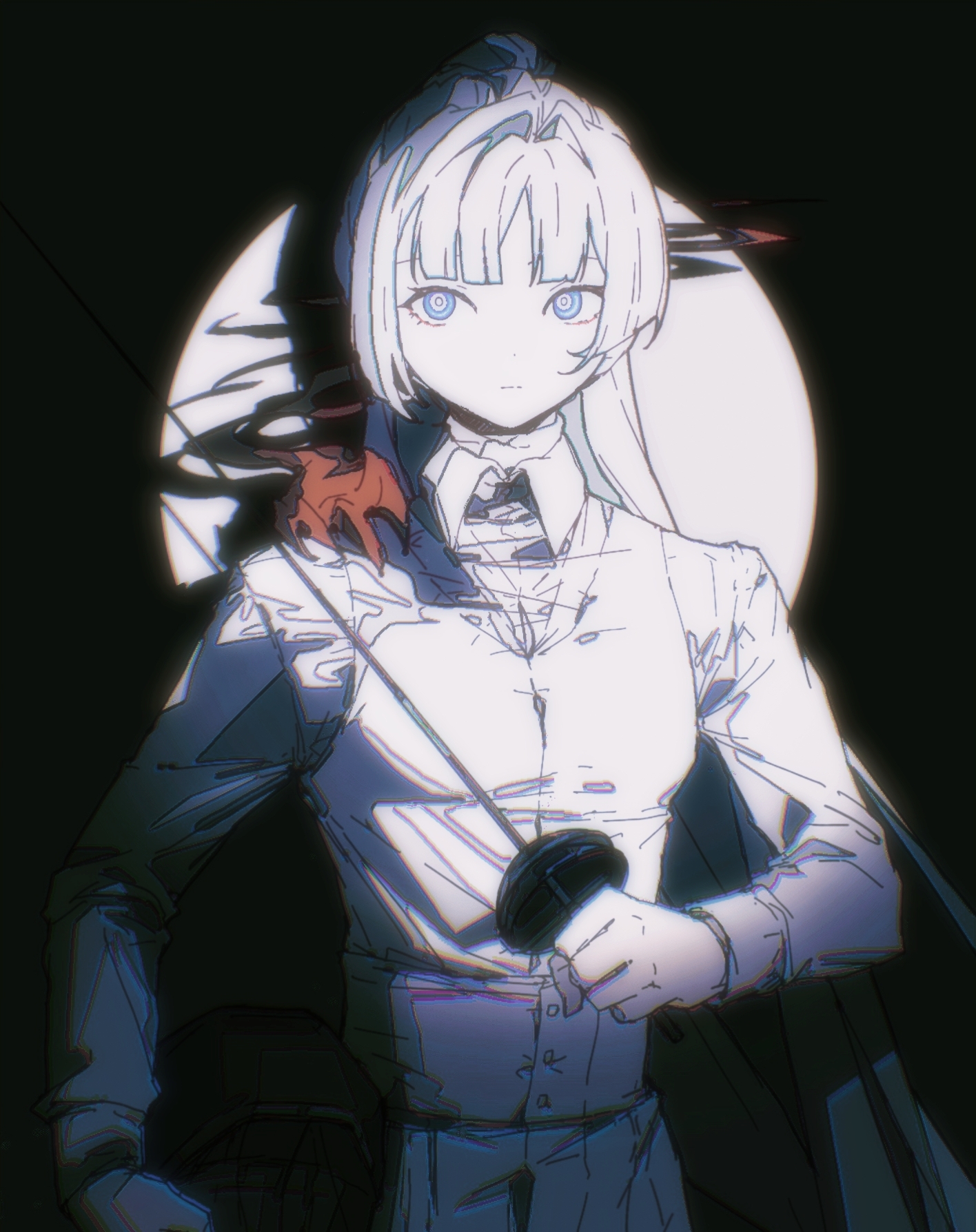 1girl black_background blue_eyes circle closed_mouth collared_shirt dikke expressionless fencing foil_(fencing) highres long_hair long_sleeves ponytail reverse:1999 ringed_eyes shadow shirt solo upper_body vest white_hair white_shirt white_vest zhizhizi