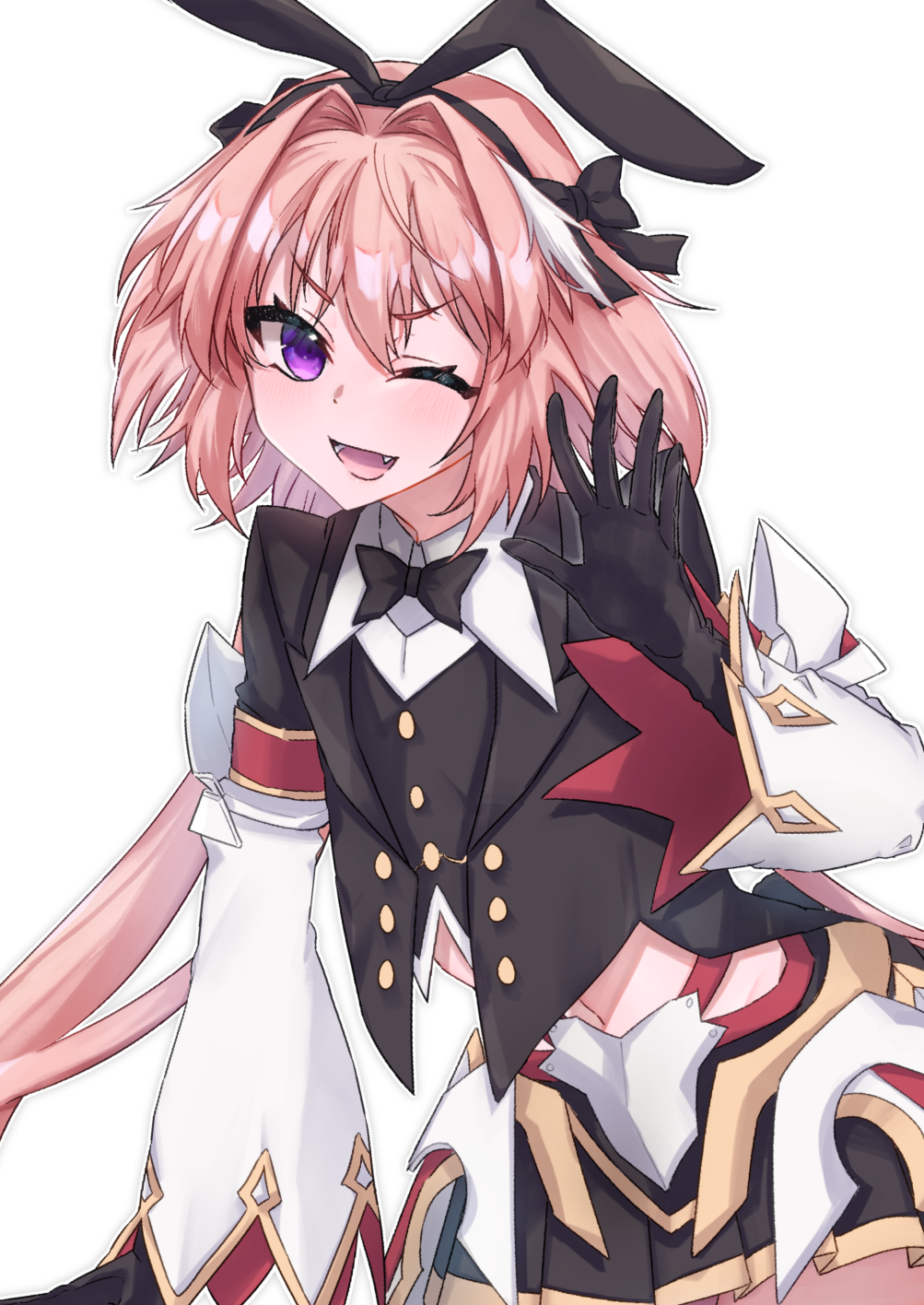 1boy animal_ears astolfo_(fate) astolfo_(saber)_(fate) astolfo_(saber)_(second_ascension)_(fate) black_bow black_gloves black_ribbon bow bowtie buttons fake_animal_ears fangs fate/grand_order fate_(series) gloves hair_bow hair_intakes hair_ribbon highres long_hair looking_at_viewer male_focus multicolored_hair one_eye_closed open_mouth pink_hair purple_eyes rabbit_ears ribbon skirt smile solo stomach streaked_hair trap twintails white_hair yu_sakae