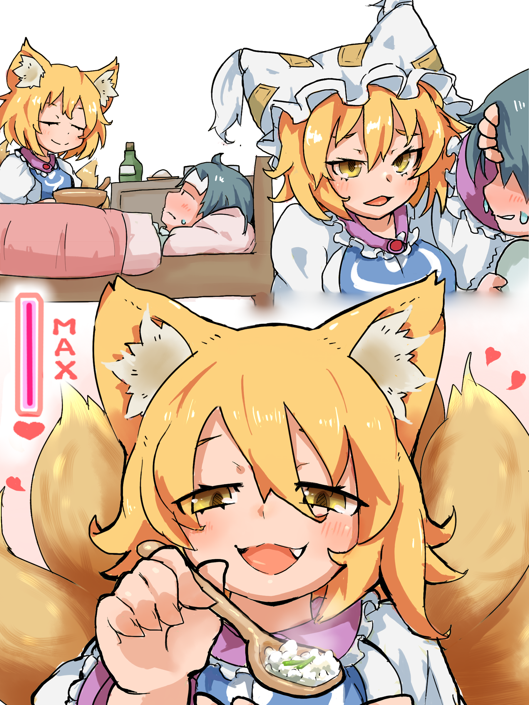 1boy 1girl :3 absurdres affection_meter affectionate animal_ears animal_hat bed blonde_hair blush bottle breasts commentary_request dress eyes_visible_through_hair faceless faceless_male fang feeding fever fox_ears fox_girl fox_tail grey_hair hair_between_eyes hat heart highres holding holding_spoon incoming_food kitsune kyuubi large_breasts long_bangs long_sleeves looking_at_viewer mob_cap multiple_tails open_mouth pillow rice short_hair sick smile spoon table tail touhou unworn_hat unworn_headwear upper_body white_dress white_headwear yakumo_ran yellow_eyes yoshiyuki_(14330975)