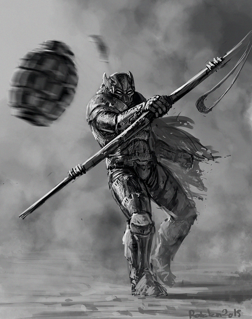 1boy armor brotherhood_of_steel cape clenched_hand cloak explosive fake_horns fallout grenade greyscale helmet horned_helmet horns looking_at_viewer monochrome power_armor rotaken sling_(weapon) staff