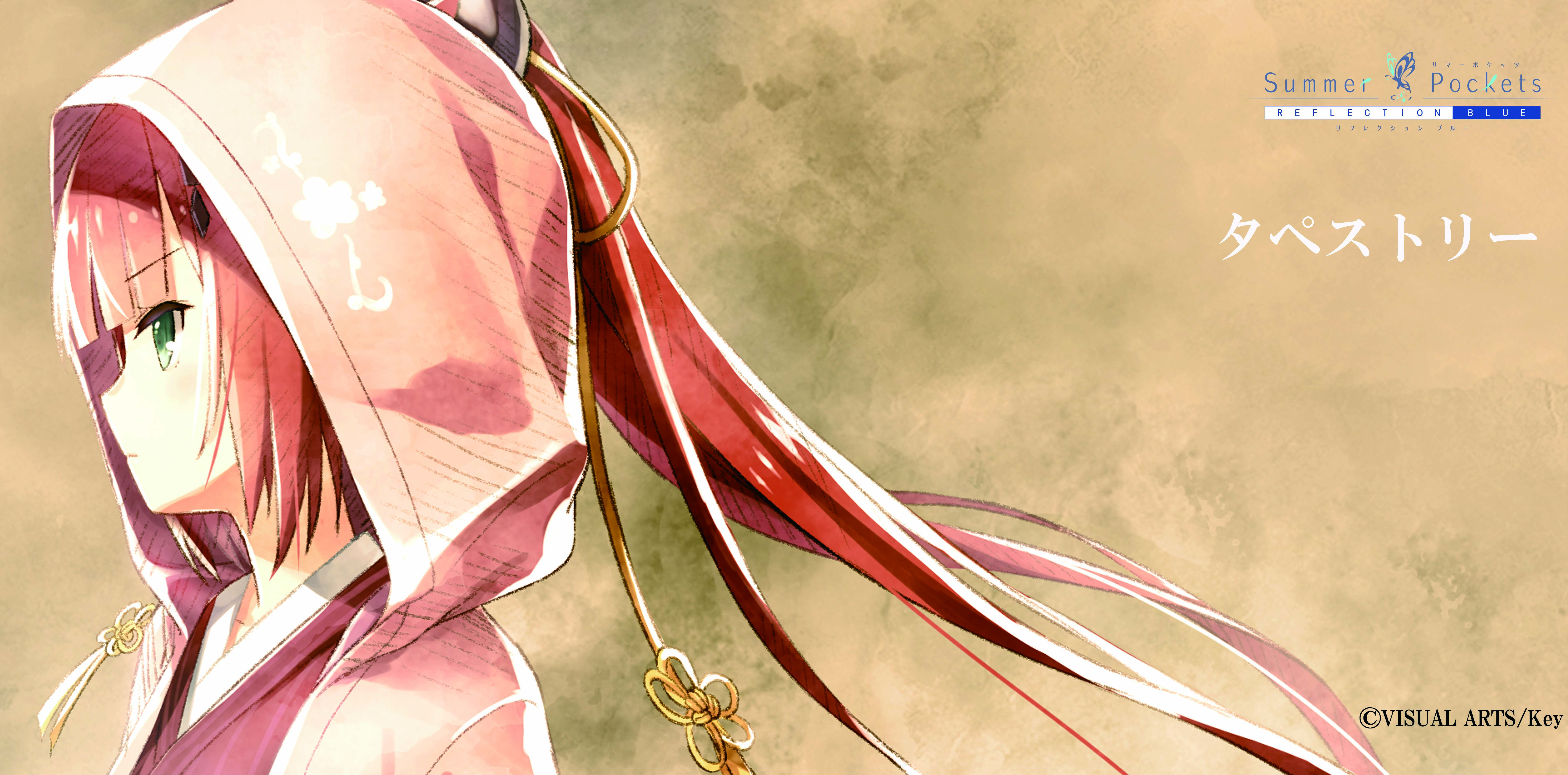 1girl absurdres alternate_eye_color blunt_bangs brown_background close-up closed_mouth company_name copyright_name floating_hair floral_print from_side green_eyes hair_ornament hairclip highres hood hood_up hooded_kimono humuyun japanese_clothes kamiyama_shiki kimono light_blush long_hair looking_afar official_art pink_kimono ponytail profile red_hair serious simple_background solo summer_pockets tassel tassel_hair_ornament v-shaped_eyebrows very_long_hair