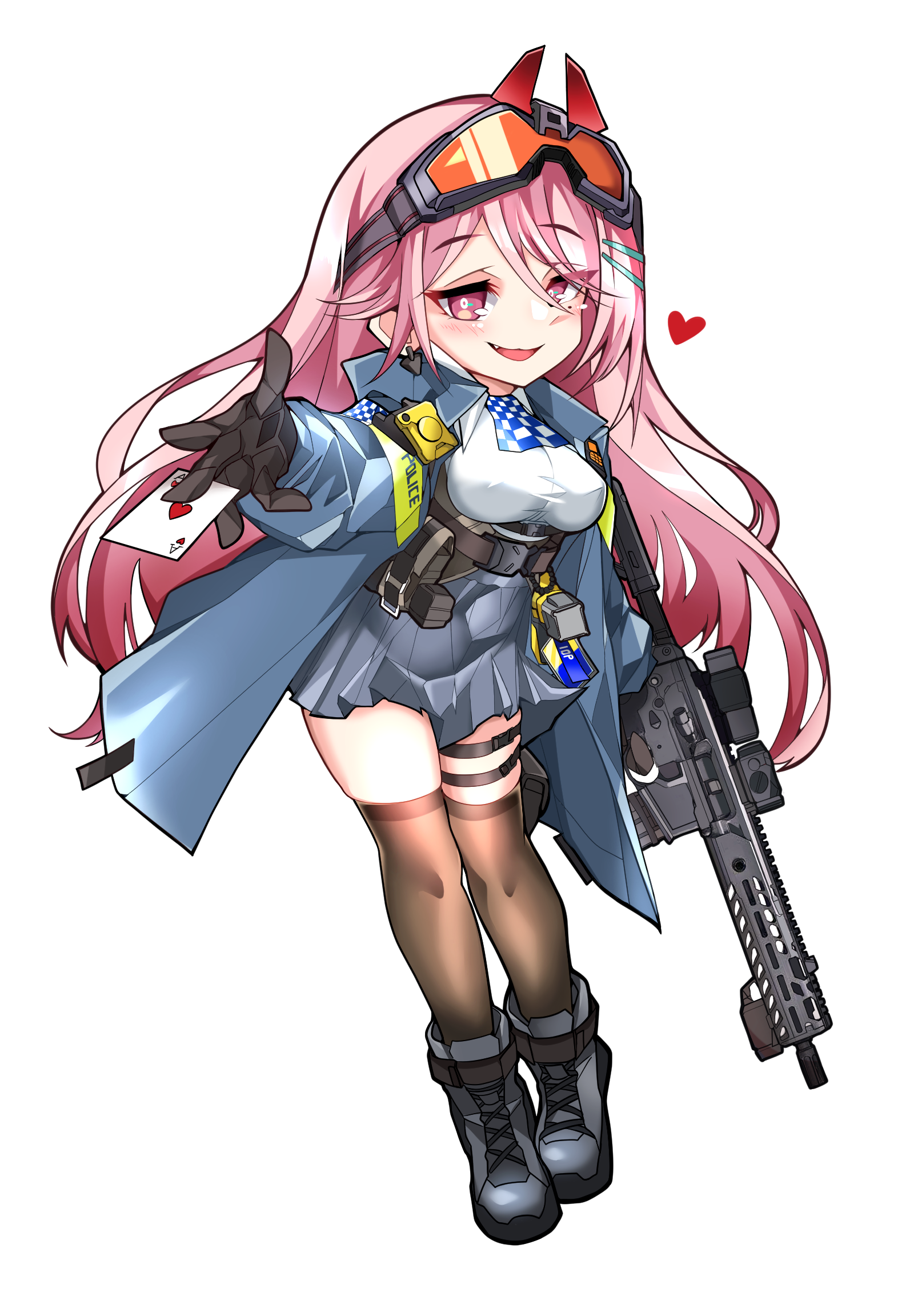 1girl ascot blush breasts checkered_ascot earrings eyewear_on_head full_body girls'_frontline gloves godgamesc2 gun hair_ornament hairclip heart heart_earrings highres jacket jewelry large_breasts long_hair looking_at_viewer mole mole_under_eye open_mouth orange_goggles pink_hair police police_uniform red_eyes rifle safety_glasses shirt sig_mcx sig_mcx_(girls'_frontline) skirt smile solo weapon white_background white_shirt