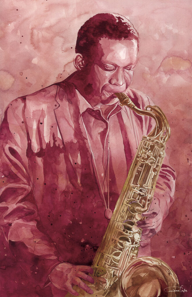 1boy artworksmil instrument jewelry music necklace original painting_(medium) playing playing_instrument portrait saxophone signature solo traditional_media watercolor_(medium)
