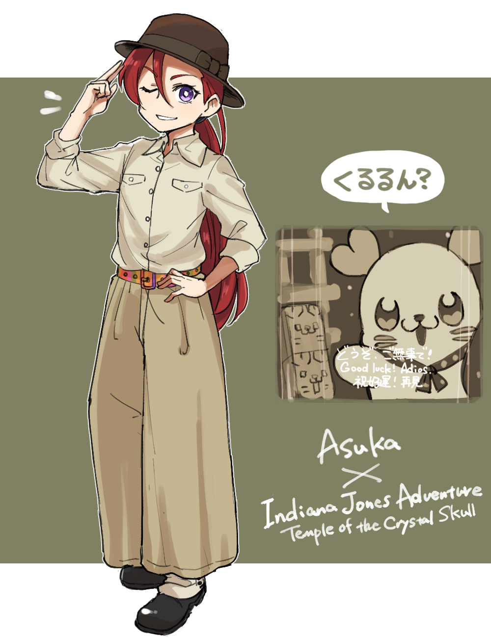 1girl alternate_hairstyle asymmetrical_bangs bell-bottoms belt black_hat bright_pupils brown_belt brown_pants character_name collared_shirt copyright_name english_text fedora grey_shirt grin hand_on_own_hip hat highres kururun_(precure) long_hair long_sleeves looking_at_viewer low_ponytail one_eye_closed pants piku_(another_pikuru) ponytail precure purple_eyes red_hair salute shirt smile solo standing takizawa_asuka translated tropical-rouge!_precure two-finger_salute very_long_hair white_pupils