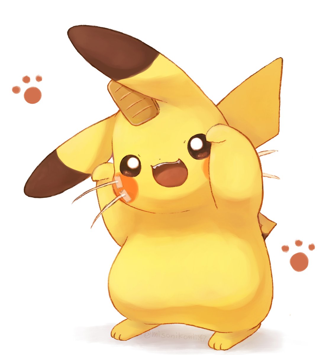 animal_ears cat_feet colored_skin cosplay dot_nose fang gen_1_pokemon highres meowth meowth_(cosplay) misonikomiii nintendo no_humans pikachu pokemon shirt smile solo tail white_shirt yellow_skin