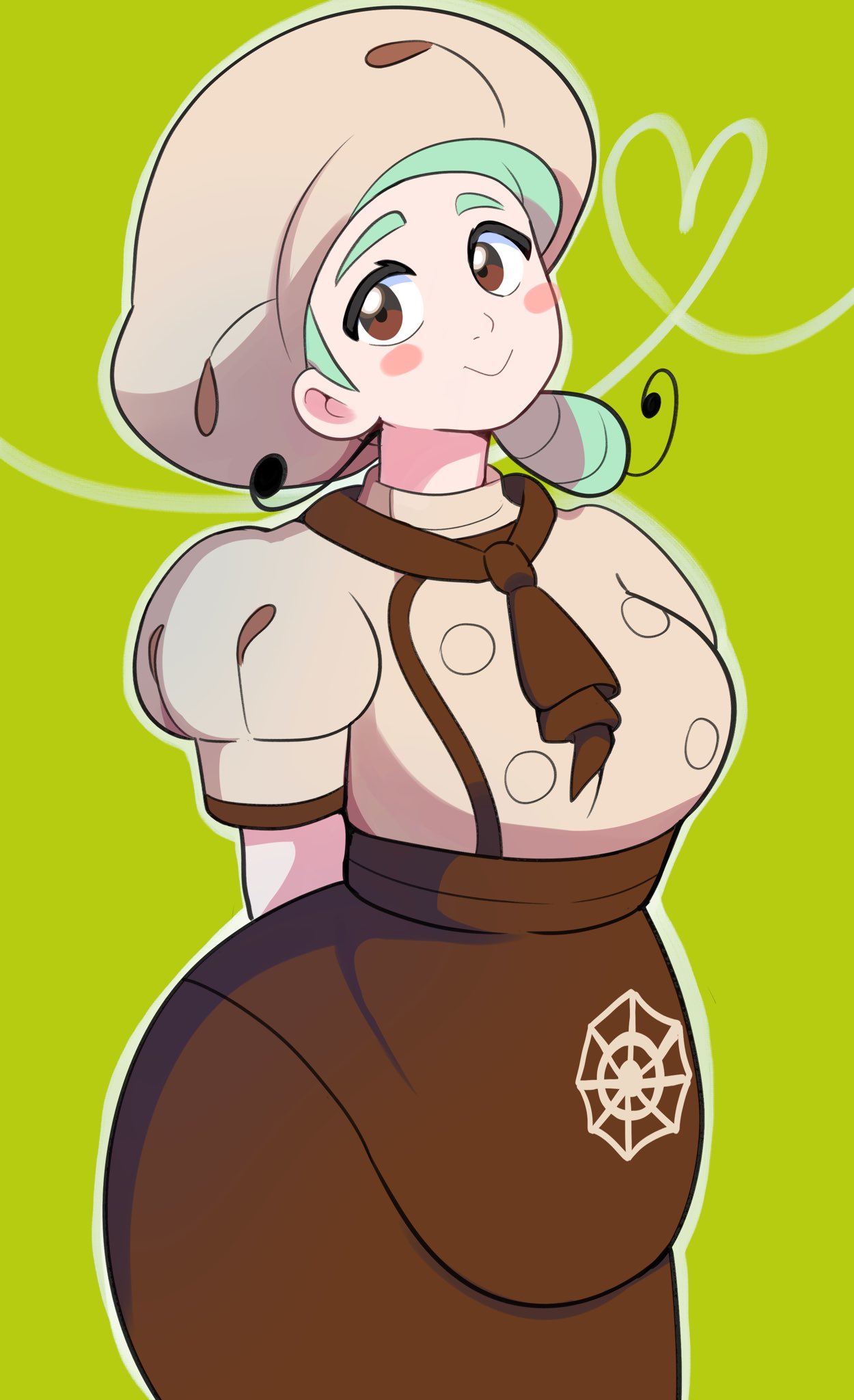 1girl apron ascot bbycheese breasts brown_apron brown_ascot brown_hair brown_skirt buttons chef_hat green_hair hat highres katy_(pokemon) low_side_ponytail medium_breasts mole mole_on_cheek muffin_top nintendo pokemon pokemon_sv puffy_short_sleeves puffy_sleeves short_sleeves skirt solo spider_web_print waist_apron