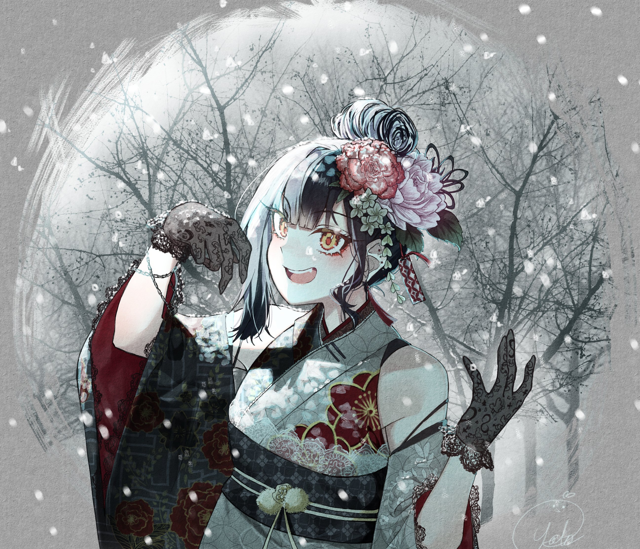 1girl black_eyeliner black_gloves black_hair black_kimono black_sash blunt_bangs chain cherry_blossoms detached_sleeves eyelashes eyeliner fang fangs flower gloves grey_hair hair_bun hair_flower hair_ornament hand_up highres hololive hololive_english japanese_clothes kimono lace lace-trimmed_sash lace_gloves long_hair long_sleeves looking_at_viewer makeup multicolored_hair multicolored_kimono obi official_alternate_costume outdoors sash shiori_novella shiori_novella_(new_year) single_hair_bun sleeveless sleeveless_kimono smile snow solo split-color_hair tree two-tone_hair virtual_youtuber white_hair white_kimono wide_sleeves yellow_eyes yoko_yukine04