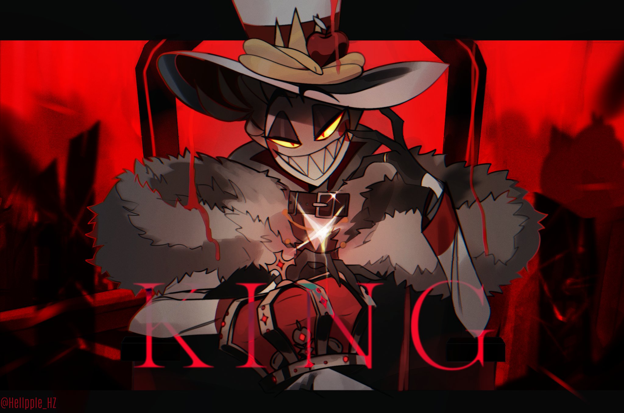 1boy apple artist_name black_border black_gloves blonde_hair border brown_collar chromatic_aberration coat collar colored_sclera commentary crown english_commentary eyebrows_visible_through_hat food fruit fur-trimmed_coat fur_trim glint gloves glowing glowing_eyes grin hand_up hat hazbin_hotel hellaverse hellpple_hz highres holding holding_crown jewelry king_(vocaloid) letterboxed long_sleeves looking_at_viewer lucifer_morningstar_(hazbin_hotel) male_focus outside_border red_eyes ring sharp_teeth short_hair sitting smile snake solo song_name teeth throne tiara top_hat twitter_username unworn_crown upper_body white_coat white_hat yellow_sclera