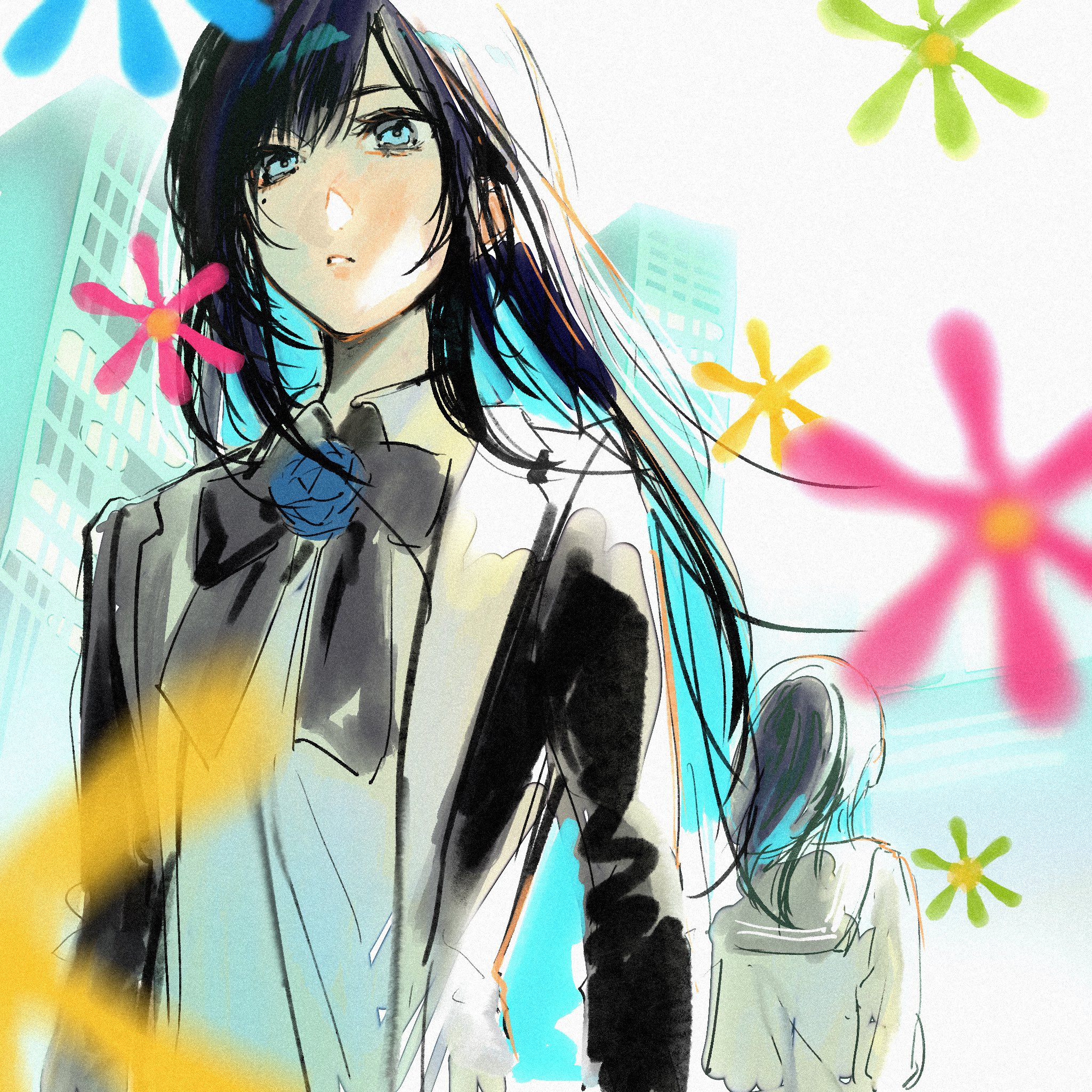 1girl ado_(utaite) adochansukisuki age_progression black_bow black_bowtie black_coat black_hair black_sailor_collar blue_eyes blue_flower blue_hair blue_rose bow bowtie brooch building chando_(ado) cloud_nine_inc coat colored_inner_hair commentary floating_hair flower flower_brooch hashtag-only_commentary highres long_hair mole mole_under_eye multicolored_hair open_clothes open_coat open_mouth rose sailor_collar school_uniform serafuku two-tone_hair upper_body utaite