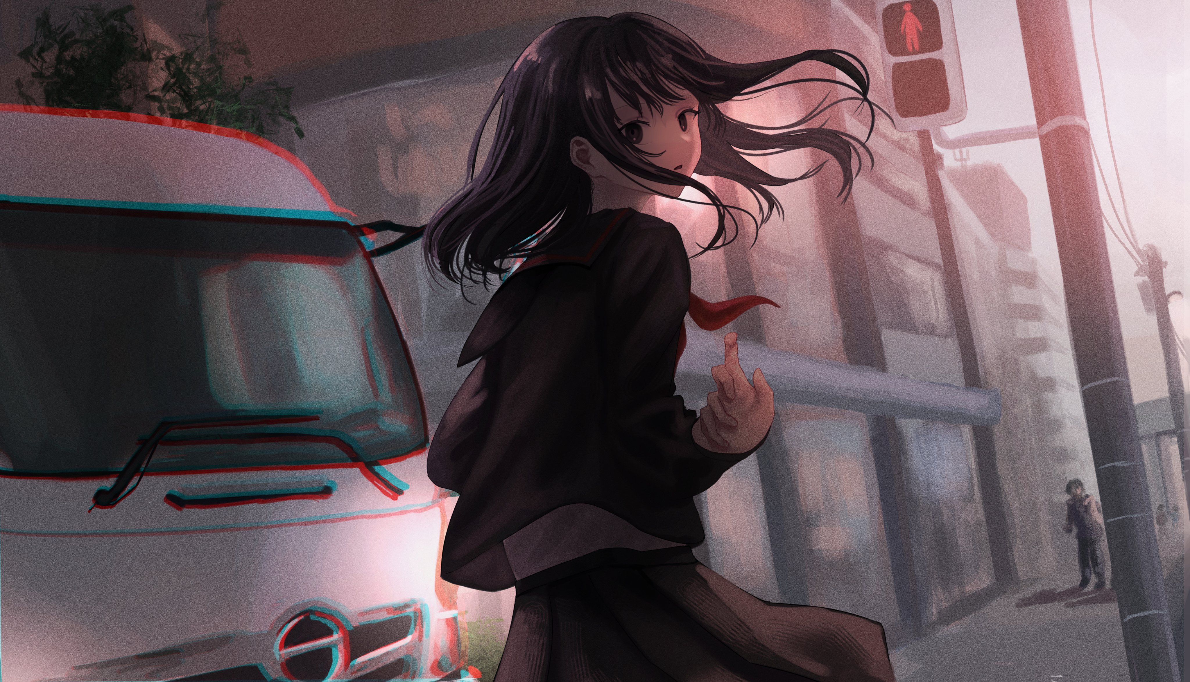 1girl 3others absurdres ascot black_eyes black_hair black_serafuku black_shirt black_skirt chromatic_aberration city floating_hair from_behind highres hino_(brand) isekai_truck kyano_(kyanora3141) lamppost looking_at_viewer motor_vehicle multiple_others open_mouth original outdoors pedestrian_lights peril pleated_skirt red_ascot school_uniform semi_truck serafuku shirt skirt solo_focus standing traffic_light truck undershirt upper_body