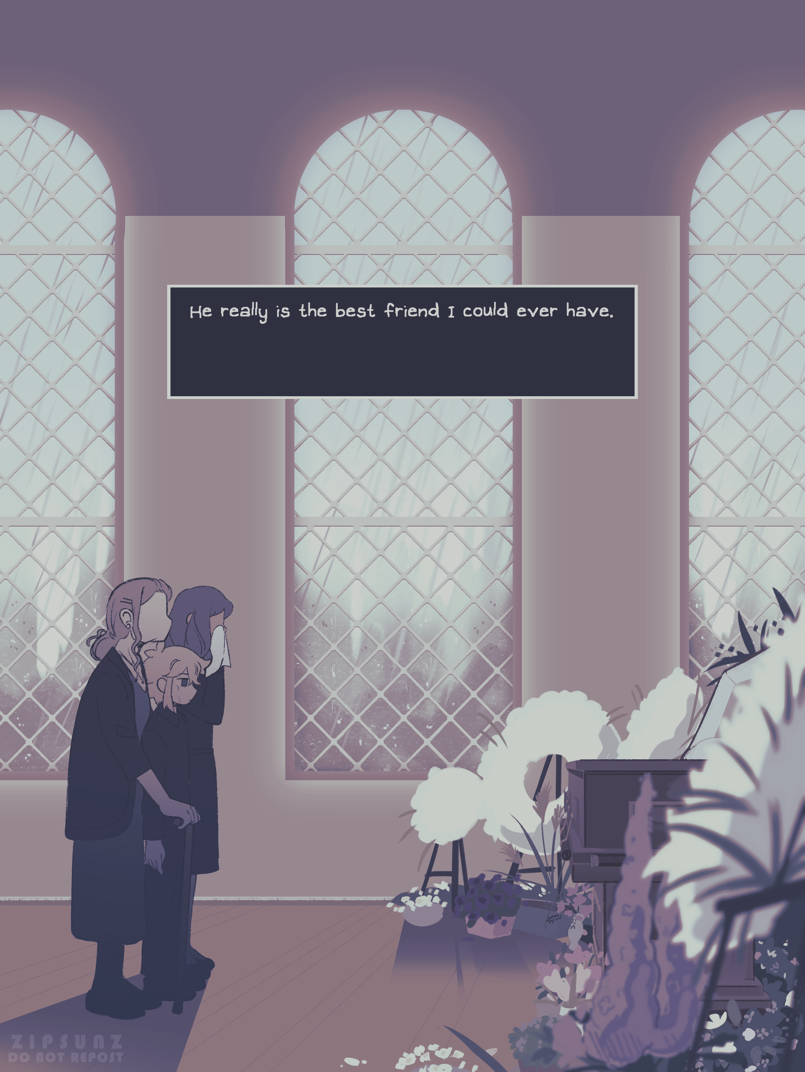 1boy 2girls absurdres artist_name basil_(faraway)_(omori) basil_(omori) blonde_hair cane casket english_text highres holding holding_cane indoors multiple_girls omori watermark zipsunz