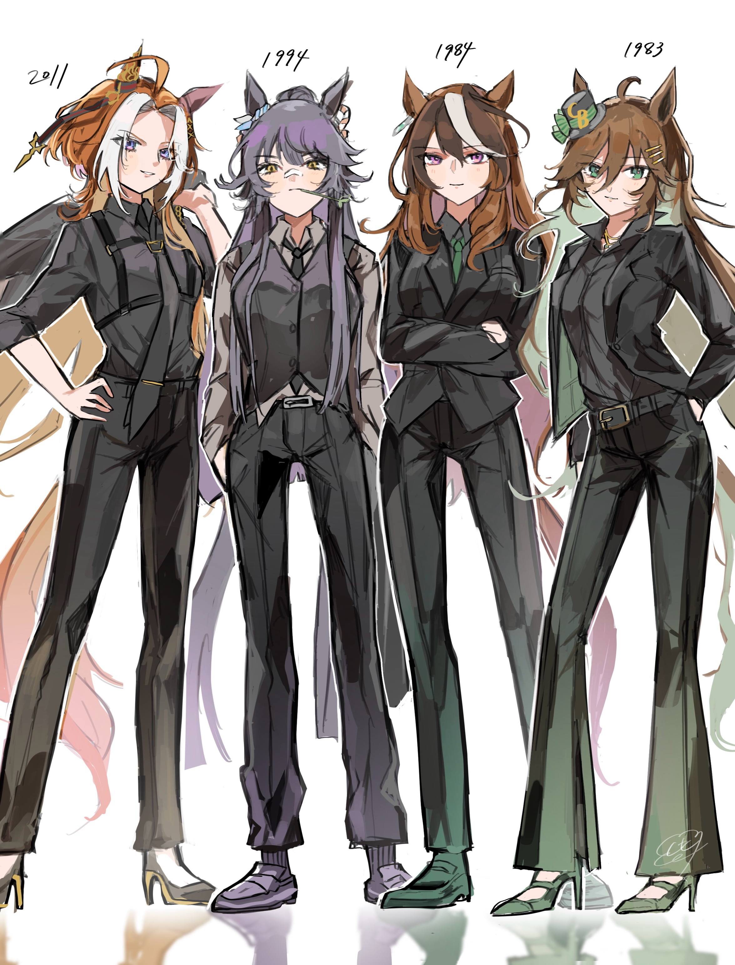1983 1984_(year) 1994 2011 4girls absurdres ahoge alternate_costume animal_ears aqua_eyes belt black_belt black_hair black_jacket black_necktie black_shirt black_shoes black_vest brown_hair closed_mouth collared_shirt commentary_request crossed_arms dress_pants ear_ornament earrings formal_clothes full_body green_necktie green_shoes grey_shirt grin hair_between_eyes hair_ornament hand_in_pocket hand_on_own_hip hands_in_pockets high_heels highres holding holding_jacket holding_unworn_clothes horse_ears horse_girl horse_tail jacket jacket_on_shoulders jewelry kumo_(mokumoku_warabi) long_hair long_sleeves mouth_hold mr._c.b._(umamusume) multicolored_hair multiple_girls narita_brian_(umamusume) necklace necktie orfevre_(old_design)_(umamusume) ponytail purple_eyes purple_shoes reflection rope shimenawa shirt shoes simple_background single_earring smile stalk_in_mouth streaked_hair suit suspenders symboli_rudolf_(umamusume) tail tilted_headwear umamusume unworn_jacket very_long_hair vest white_background white_hair yellow_eyes
