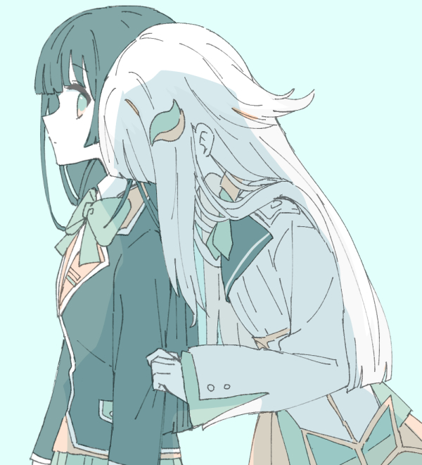 2girls arms_at_sides black_hair black_jacket blazer bow bowtie buttoned_cuffs buttons cowboy_shot from_side green_background green_bow green_bowtie green_skirt head_on_another's_shoulder jacket jacket_tug lize_helesta long_hair long_sleeves looking_at_viewer multiple_girls nijisanji pleated_skirt profile school_uniform sidelocks sideways_glance simple_background skirt sou_(tuhut) straight_hair tsukino_mito virtual_youtuber white_hair white_jacket yuri