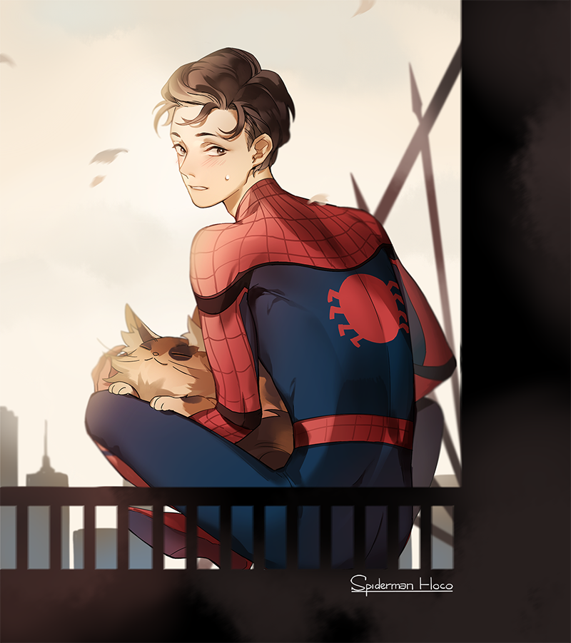 1boy animal animal_ears animal_nose animal_print animification back blue_bodysuit blush bodysuit brown_eyes brown_fur brown_hair building cat cat_ears city day from_behind kottie looking_at_viewer looking_back marvel multicolored_bodysuit outdoors peter_parker red_bodysuit short_hair sitting sky skyscraper spider-man spider-man:_homecoming spider-man_(series) spider_print spider_web_print superhero_costume sweatdrop teeth two-tone_bodysuit white_sky