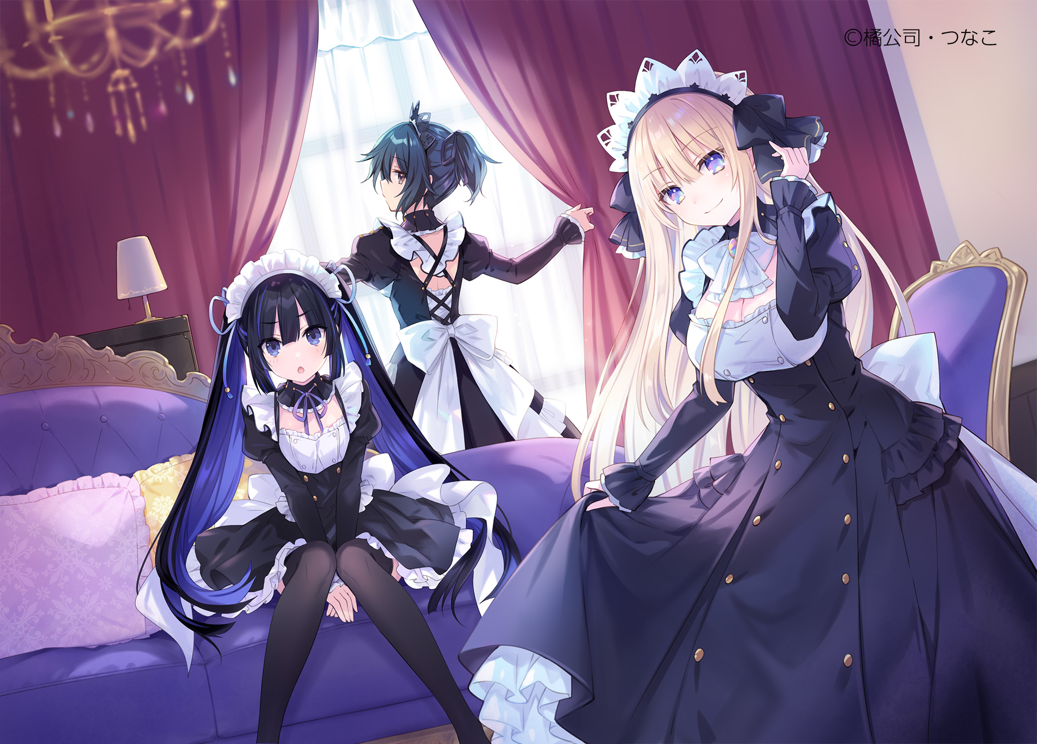 3girls artist_name black_hair blonde_hair blue_eyes blue_hair bow bowtie breasts brown_eyes cleavage couch curtains frills fuyajou_ruri highres jewelry karasuma_kuroe kuozaki_saika looking_at_viewer maid maid_headdress medium_breasts multicolored_eyes multicolored_hair multiple_girls neck_ribbon official_art ou-sama_no_propose ribbon thighhighs tsunako twintails waist_bow