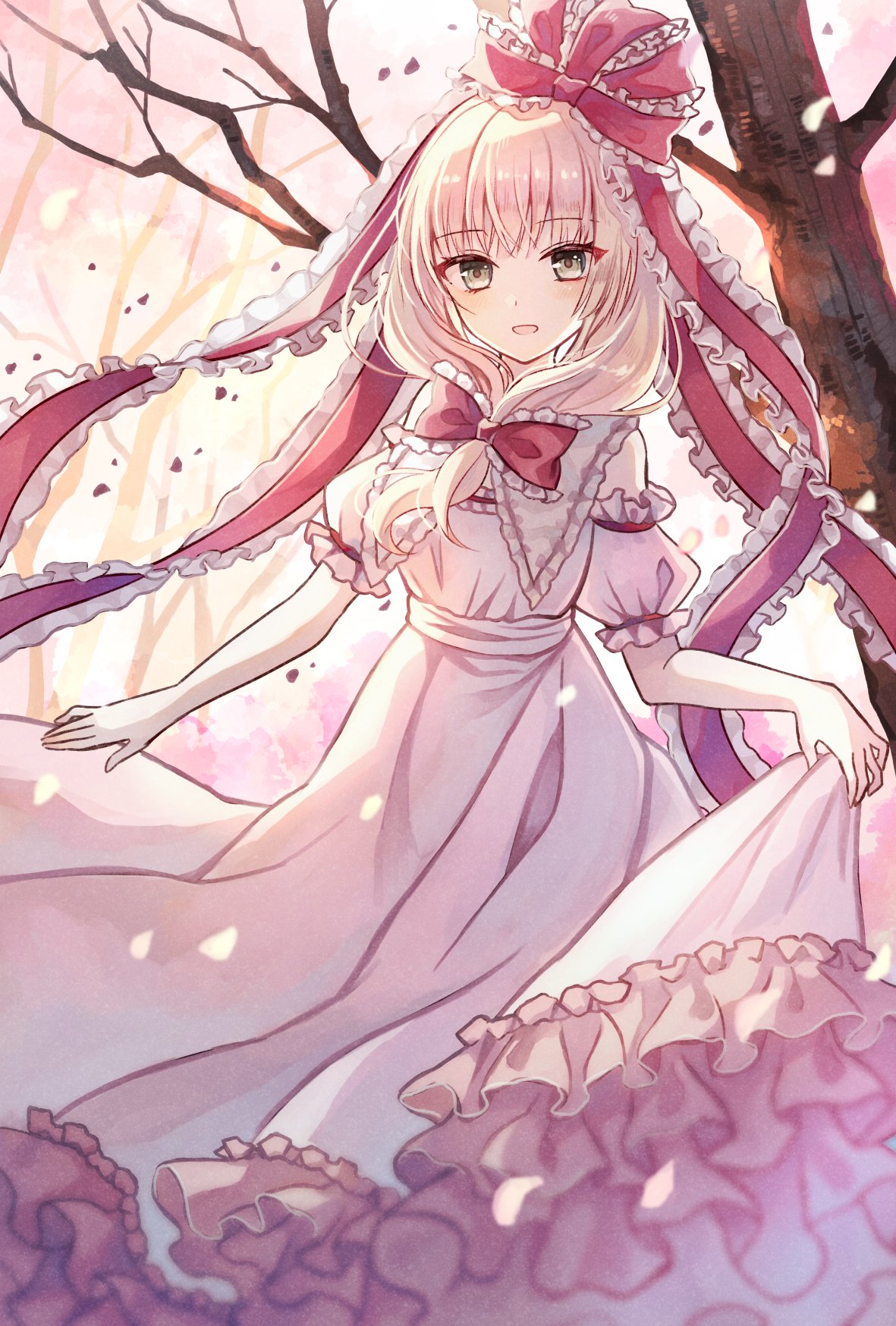 1girl alternate_color bow cherry_blossoms dress frilled_bow frilled_dress frilled_ribbon frills front_ponytail green_eyes hair_bow hair_ribbon highres kagiyama_hina lifting_own_clothes looking_at_viewer miyakure off-shoulder_dress off_shoulder outdoors puffy_short_sleeves puffy_sleeves ribbon short_sleeves solo touhou tree white_hair