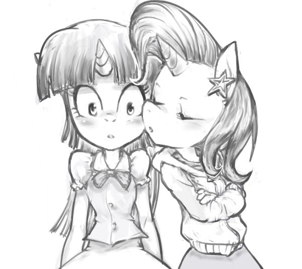 2girls animal_ears blush bow bowtie conoghi crossed_arms hair_ornament hasbro hood hooded_vest hoodie horns horse_ears horse_girl imminent_kiss long_hair monochrome multiple_girls my_little_pony my_little_pony:_equestria_girls my_little_pony:_friendship_is_magic open_mouth puffy_sleeves school_uniform shirt short_sleeves single_horn skirt standing star_(symbol) star_hair_ornament surprised trixie_lulamoon twilight_sparkle unicorn_girl vest yuri