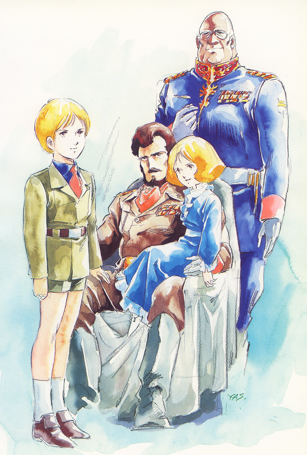 1970s_(style) 1980s_(style) 1girl 3boys artesia_som_deikun bald beard belt blonde_hair boots brown_hair casval_rem_deikun chair char_aznable child degwin_sodo_zabi dress emblem facial_hair family fat fat_man formal_clothes glasses gundam highres insignia manly military military_uniform mobile_suit_gundam multiple_boys necktie old oldschool painting_(medium) promotional_art retro_artstyle sayla_mass scan scarf science_fiction serious shorts siblings sitting sitting_on_lap sitting_on_person size_difference socks traditional_media white_socks yasuhiko_yoshikazu zeon zeon_zum_deikun