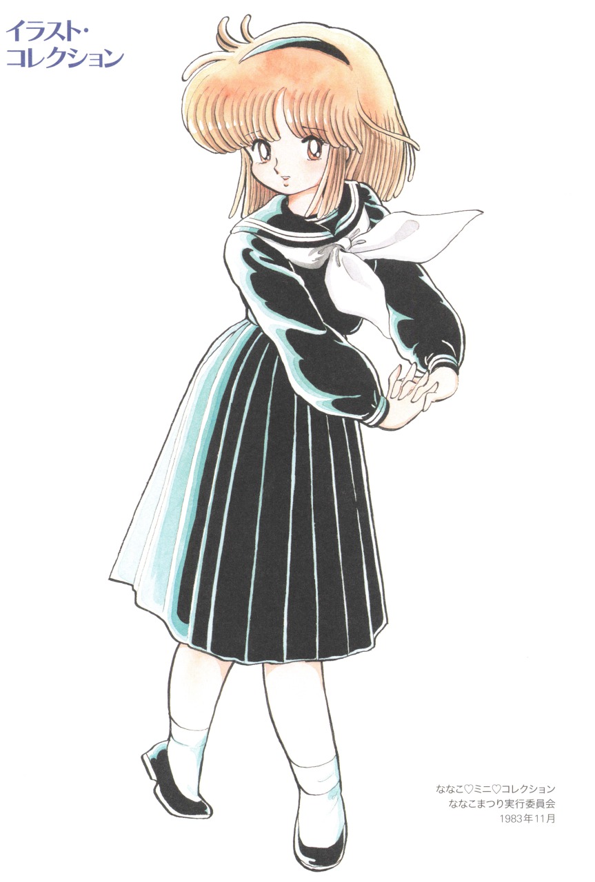 1980s_(style) 1983 1girl azuma_hideo brown_eyes brown_hair cracking_knuckles flats full_body highres medium_hair nanako_(nanako_sos) nanako_sos non-web_source official_art oldschool pleated_skirt retro_artstyle sailor_collar school_uniform skirt solo traditional_media translation_request white_background