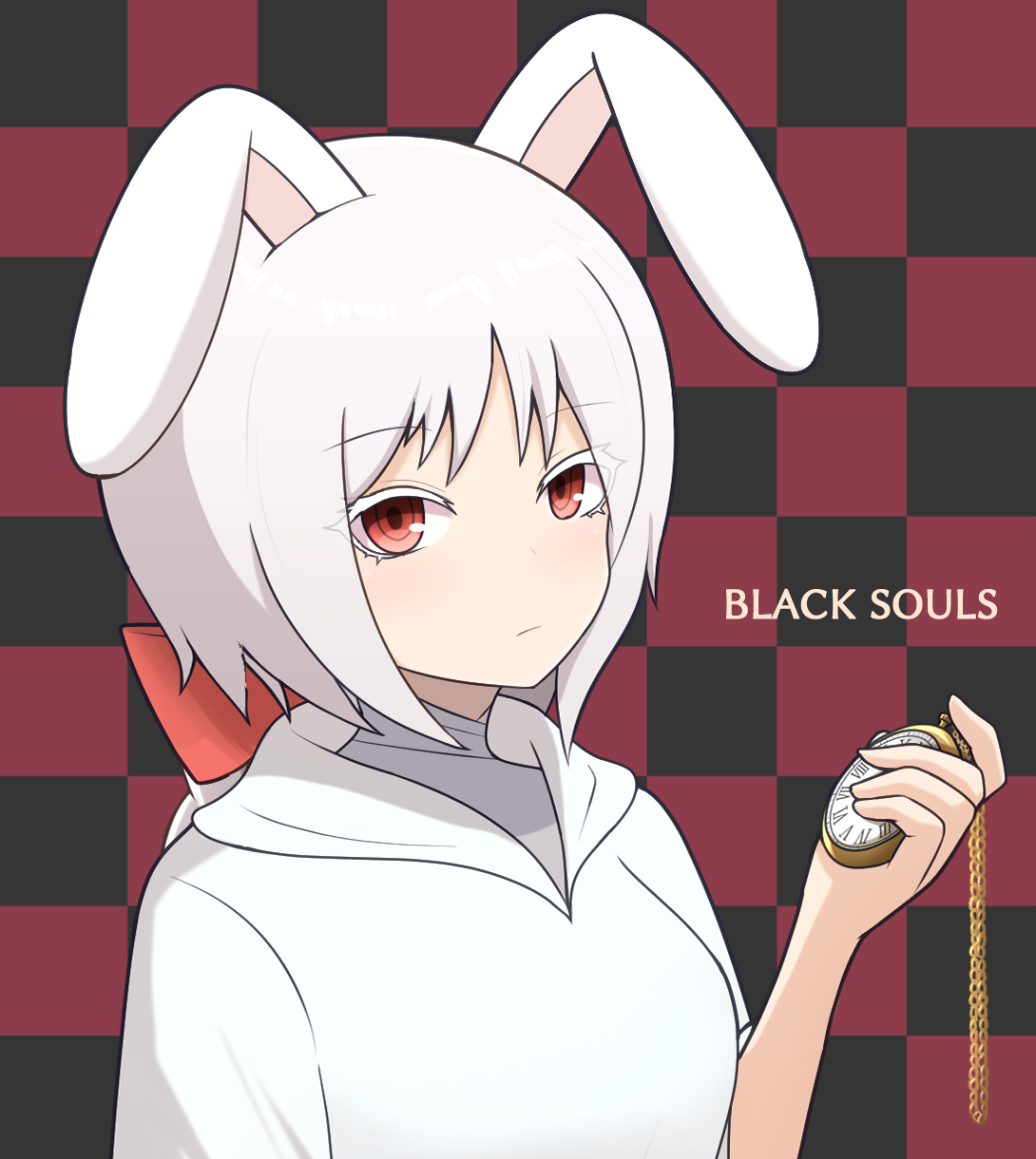 1girl animal_ears black_souls black_souls_2 braid chain checkered_background cloak closed_mouth dress hand_up highres holding holding_pocket_watch long_hair long_sleeves looking_at_viewer node_(black_souls) pocket_watch rabbit_ears red_eyes solo udododo very_long_hair watch white_cloak white_dress white_hair