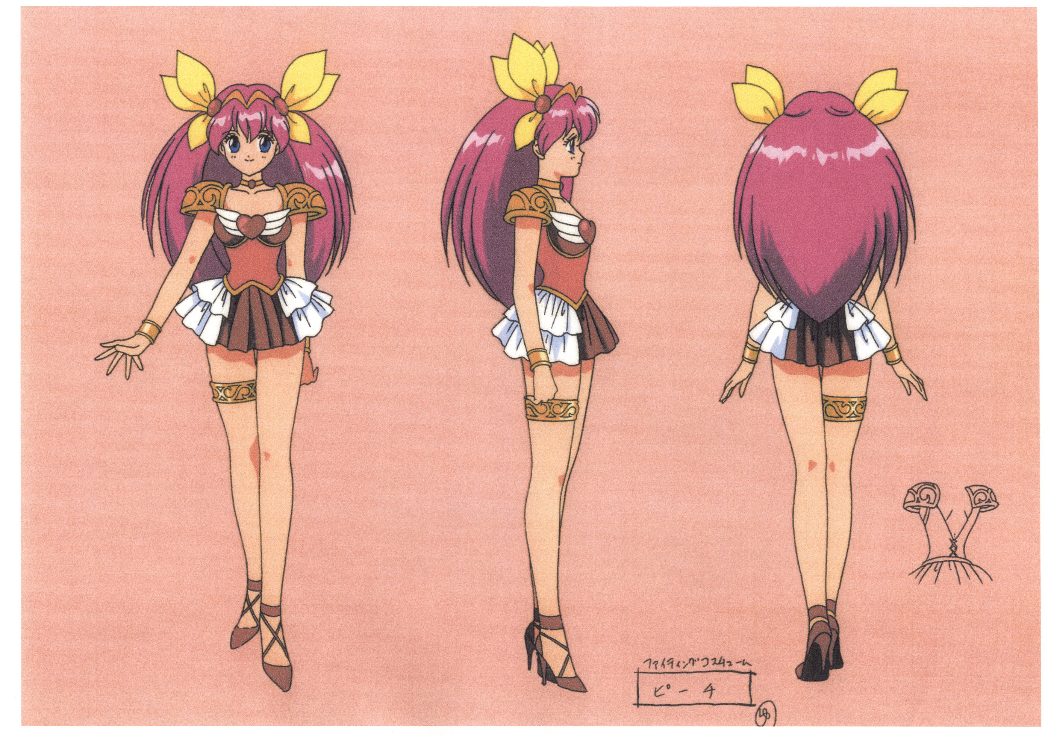1990s_(style) 1girl absurdres ai_tenshi_densetsu_wedding_peach armor back bad_link blue_eyes bracelet brooch reference_sheet choker facing_viewer full_body hanasaki_momoko headdress heart heart_brooch high_heels highres jewelry long_hair looking_at_viewer magical_girl miniskirt multiple_views official_art olm_(studio) pauldrons pink_background pink_hair profile red_footwear retro_artstyle scan shoulder_armor simple_background skirt smile standing thighlet turnaround wedding_peach wing_brooch