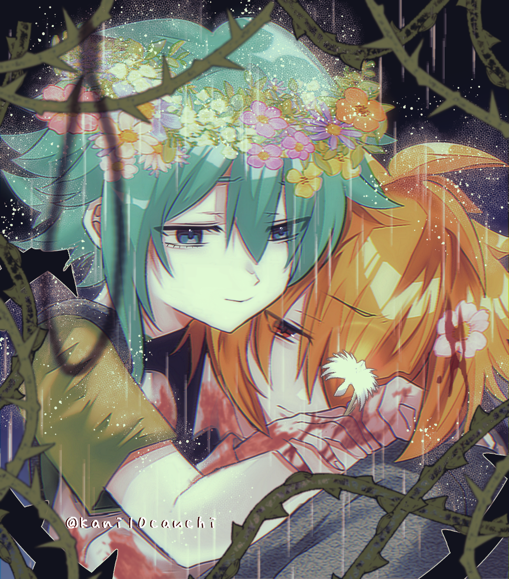 2boys basil_(faraway)_(omori) basil_(headspace)_(omori) basil_(omori) blonde_hair blood blood_on_hands closed_mouth flower green_eyes green_hair hair_flower hair_ornament hair_over_one_eye head_wreath kauchi_(kani10cauchi) multiple_boys omori red_eyes short_hair twitter_username