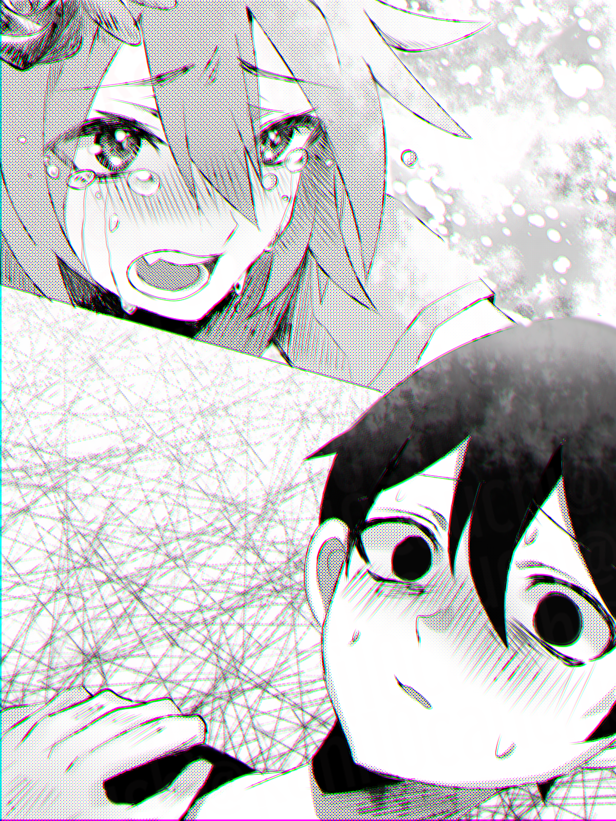 2boys basil_(faraway)_(omori) basil_(omori) crying crying_with_eyes_open flower greyscale hair_flower hair_ornament highres kauchi_(kani10cauchi) looking_at_another looking_at_viewer monochrome multiple_boys omori open_mouth parted_lips short_hair sunny_(omori) tears