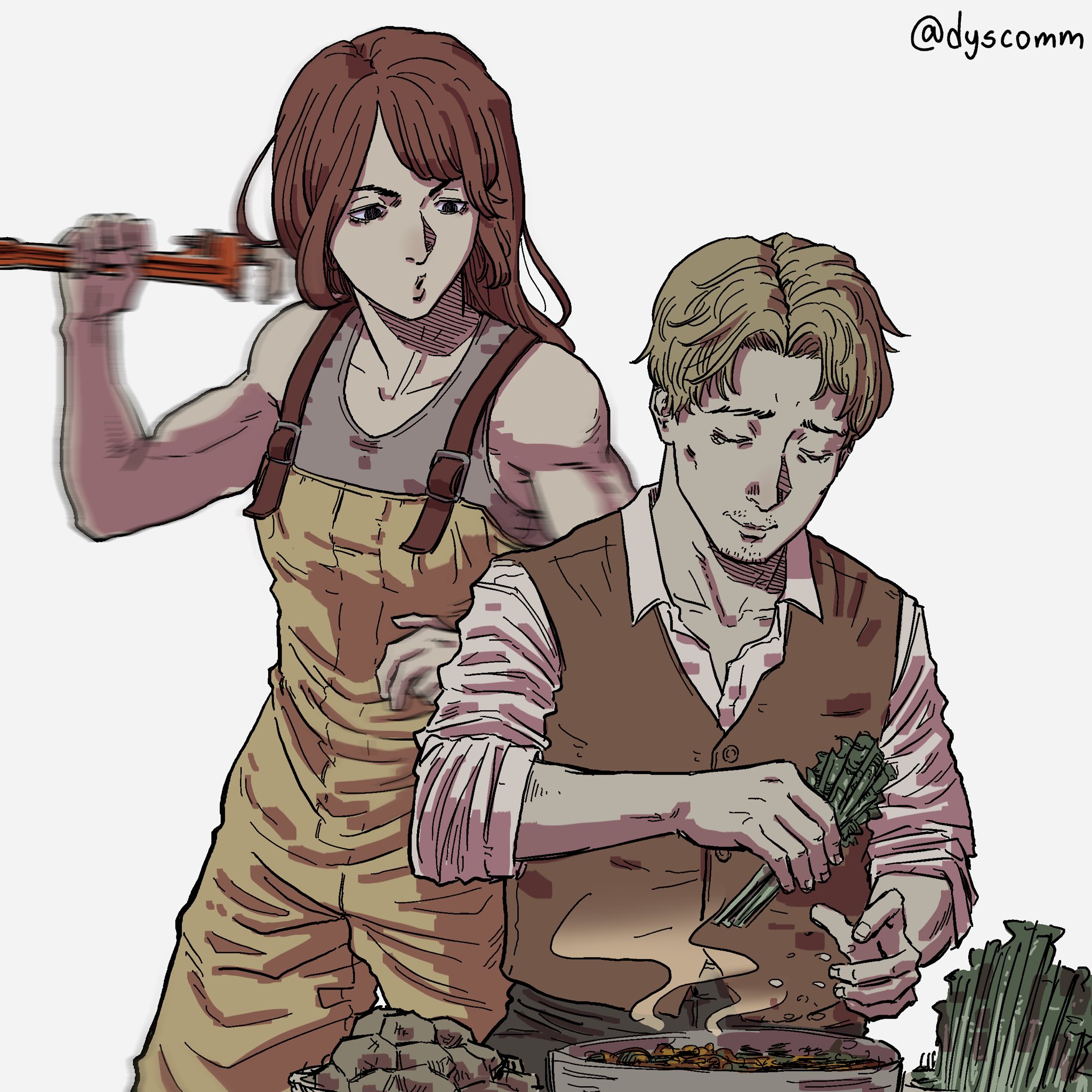 1boy 1girl abella_(fear_&_hunger) adjustable_wrench behind_another blonde_hair brown_tank_top brown_vest closed_eyes commentary cooking cowboy_shot dyscomm english_commentary fear_&_hunger fear_&_hunger_2:_termina henryk_(fear_&_hunger) highres long_hair muscular muscular_female overalls parted_lips peril pipe_wrench red_hair shirt short_hair simple_background sleeves_rolled_up standing tank_top twitter_username upper_body v-shaped_eyebrows vest white_background white_shirt wrench yellow_overalls