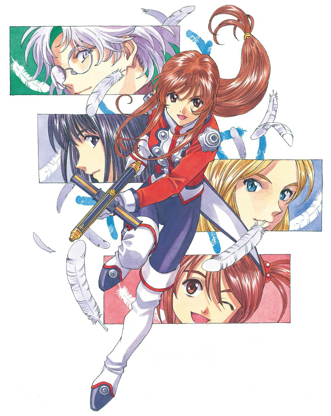 5girls belt black_hair black_pants blonde_eyebrows blonde_hair boots brown_eyes brown_hair buttons child choppy_bangs closed_mouth coattails collar coquelicot_(sakura_taisen) crack cracked_glass double-breasted erica_fontaine eyelashes feathers full_body glasses gloves glycine_bleumer green_eyes green_headband gun hair_between_eyes hair_bobbles hair_ornament head_only headband highres holding holding_gun holding_unworn_clothes holding_weapon jacket kitaooji_hanabi leg_up lobelia_carlini long_hair long_sleeves looking_ahead looking_at_viewer low-tied_long_hair mandarin_collar matsubara_hidenori messy_hair multiple_girls nose official_art one_eye_closed open_mouth paneled_background pants profile red_jacket red_sleeves red_uniform rimless_eyewear round_eyewear sakura_taisen sakura_taisen_iii sega shadow short_twintails side_slit sidelocks simple_background smile straight_hair submachine_gun thigh_boots third-party_source tight_clothes tight_pants traditional_media twintails v-shaped_eyebrows wavy_ends wavy_sidelocks weapon white_background white_collar white_feathers white_footwear white_hair white_wrist_cuffs wrist_cuffs
