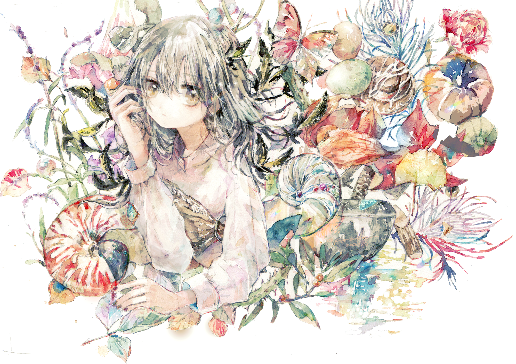 1girl ass brown_eyes flower grey_hair highres kazuka leaf long_hair long_sleeves looking_at_viewer mortar_(bowl) original painting_(medium) plant shell shirt solo traditional_media upper_body watercolor_(medium) white_background white_shirt