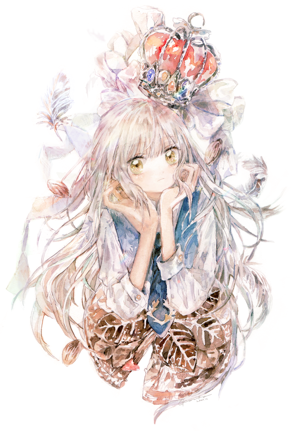 1girl blue_vest crown feathers grey_hair highres kazuka long_hair long_sleeves looking_at_viewer original painting_(medium) shirt solo traditional_media upper_body vest watercolor_(medium) white_background white_shirt yellow_eyes