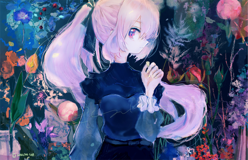 1girl black_shirt cowboy_shot flower kazuka long_hair looking_at_viewer original pink_hair ponytail purple_eyes shirt sidelocks sideways_glance solo