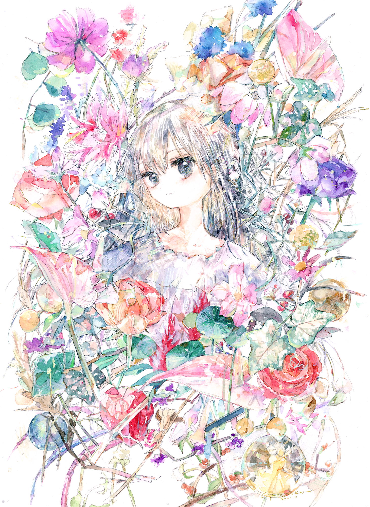 1girl black_eyes black_hair flower frilled_shirt frills highres kazuka leaf long_hair looking_at_viewer original painting_(medium) plant shirt solo traditional_media upper_body watercolor_(medium) white_background white_shirt