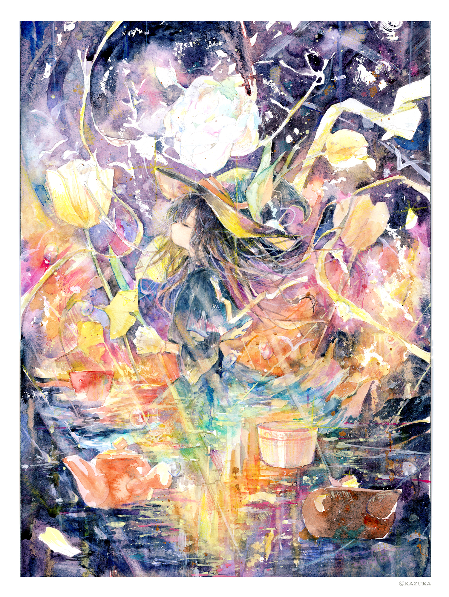 1girl black_dress black_hair capelet closed_eyes cup dress floating_hair flower from_side gloves hat highres kazuka original painting_(medium) solo teapot traditional_media watercolor_(medium) white_gloves witch_hat