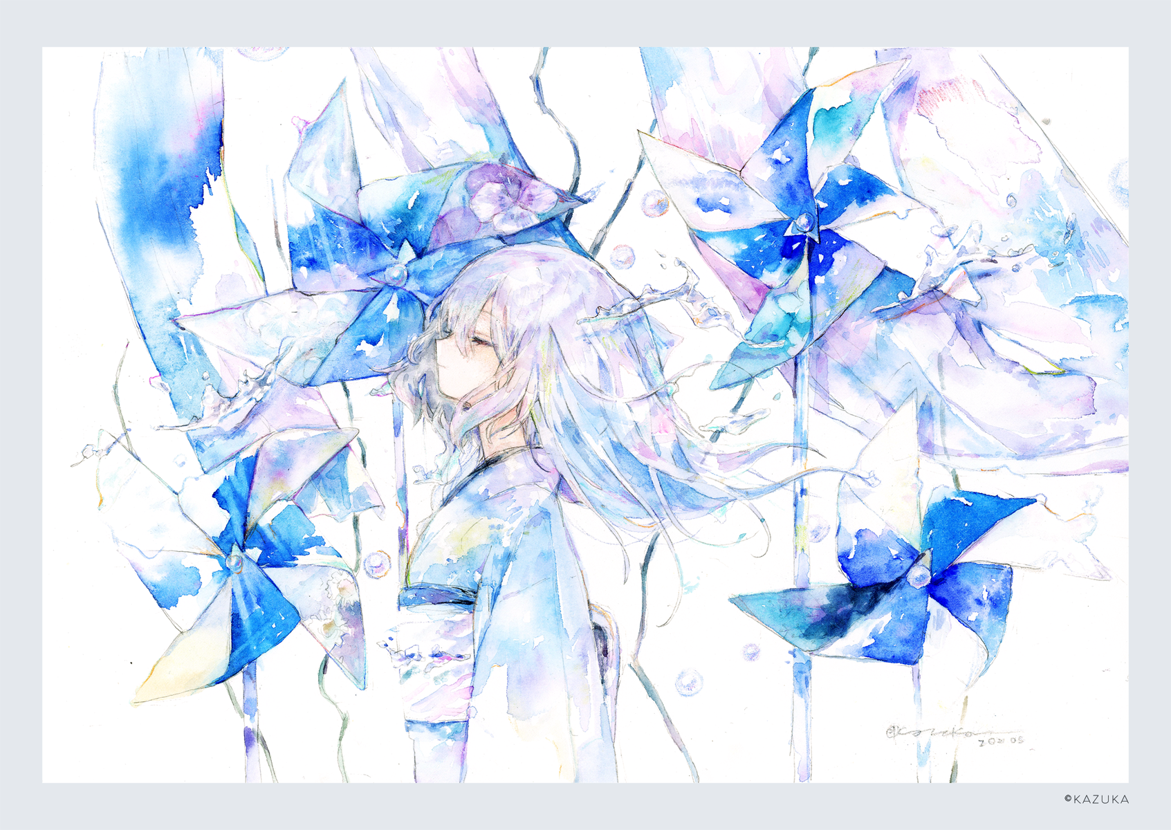 1girl blue_eyes blue_kimono closed_eyes floating_hair from_side highres japanese_clothes kazuka kimono long_hair obi original painting_(medium) sash solo traditional_media upper_body water_drop watercolor_(medium) white_background wind