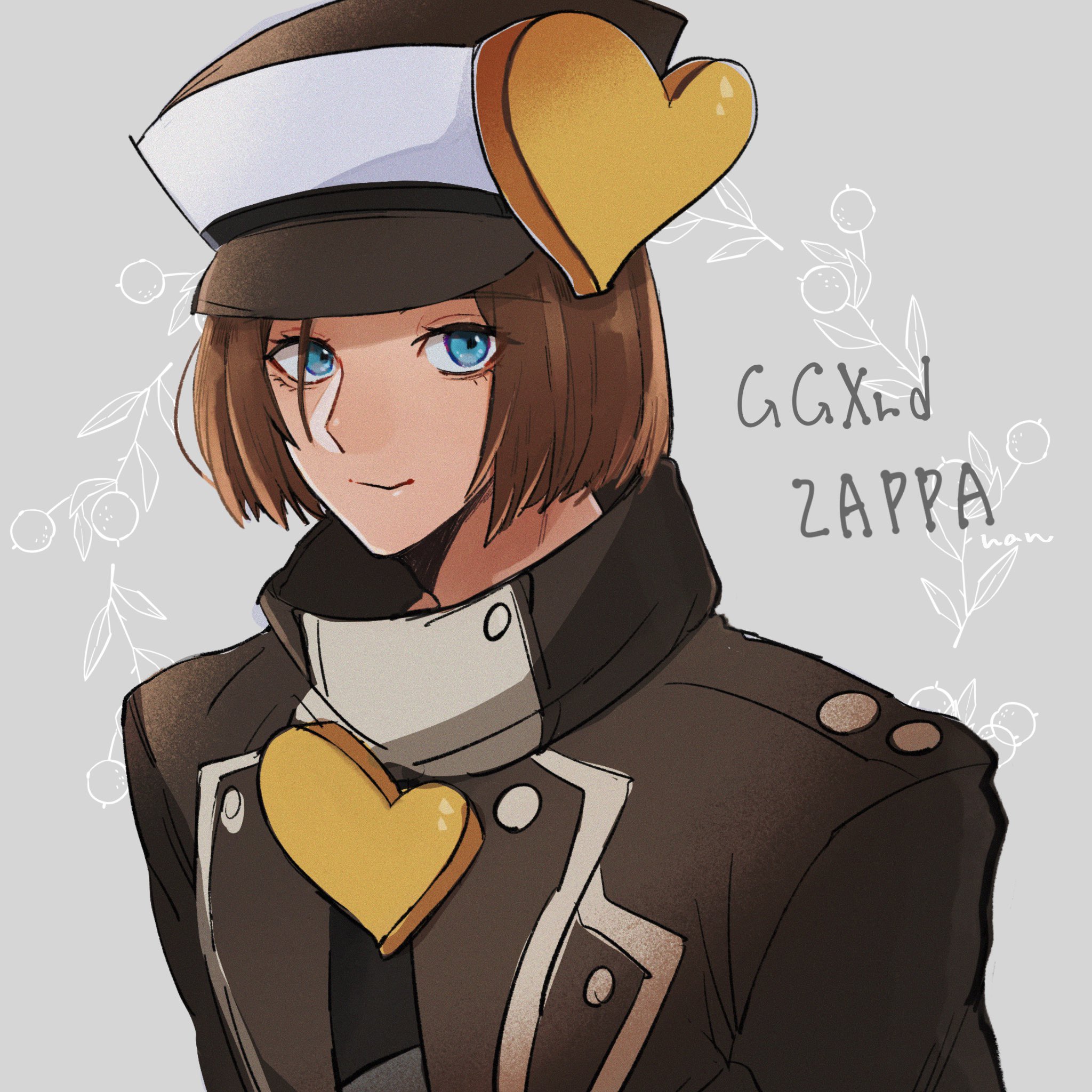 1boy blue_eyes brown_hair cheesenaanlassi guilty_gear guilty_gear_xrd hat hat_ornament heart heart_hat_ornament highres jacket looking_at_viewer medium_hair portrait smile solo solo_focus straight_hair zappa