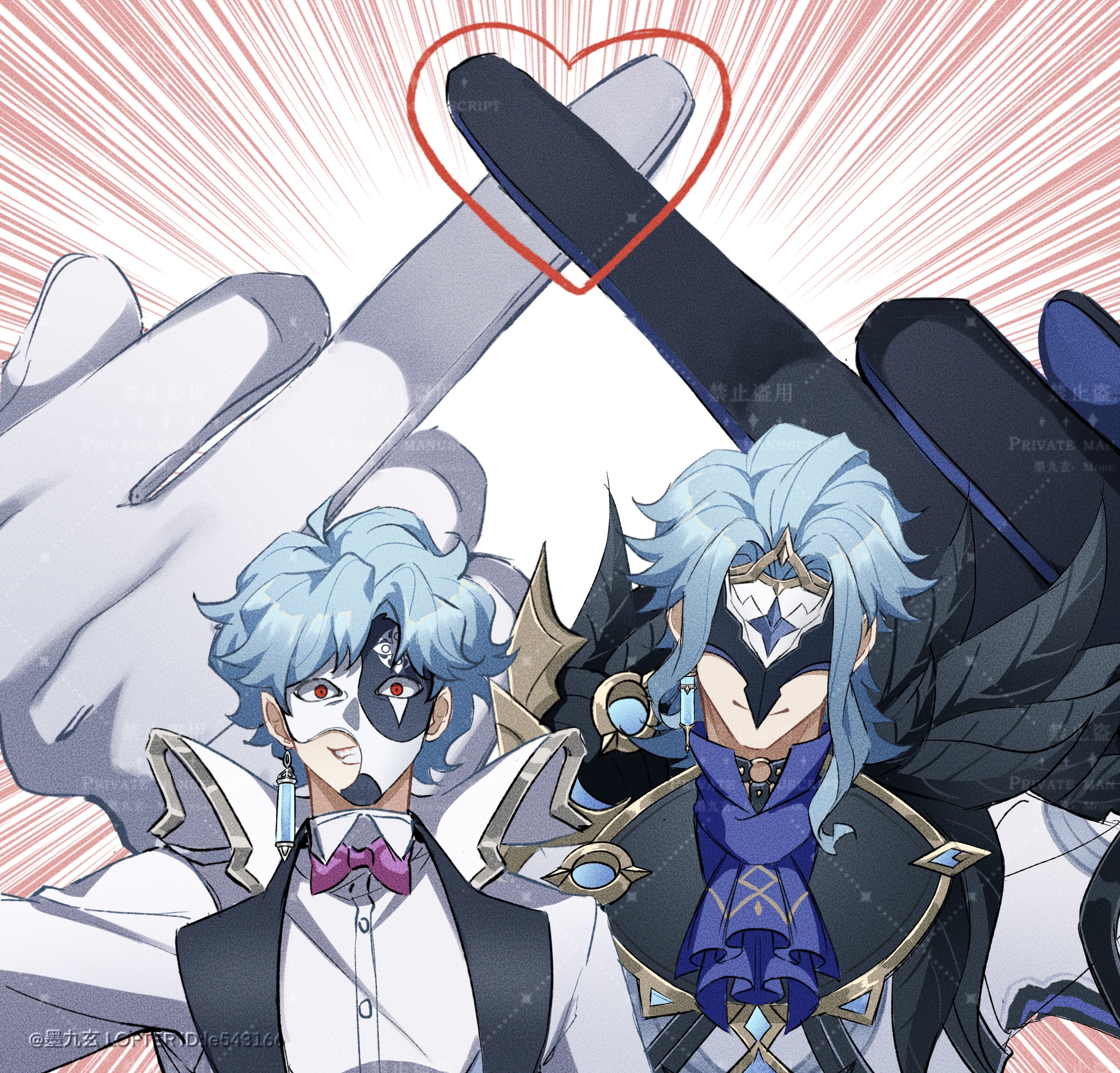 2boys absurdres artist_name ascot black_choker black_gloves blue_ascot blue_gloves blue_hair bow bowtie buttons chinese_commentary choker closed_mouth coat collared_coat collared_shirt commentary_request covered_eyes dottore_(genshin_impact) dottore_(manga)_(genshin_impact) dual_persona earrings emphasis_lines eye_mask feather_trim genshin_impact gloves gold_trim grin heart highres jewelry lapels lofter_username looking_at_viewer male_focus mask mojiuxuan multiple_boys o-ring o-ring_choker open_clothes open_coat parted_bangs pink_bow pink_bowtie red_eyes shirt short_hair sidelocks simple_background single_earring smile teeth two-tone_gloves upper_body watermark white_background white_coat white_gloves white_shirt